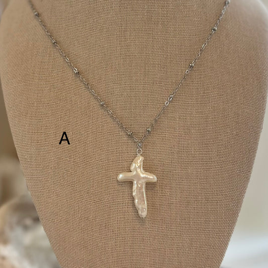 Baroque Pearl Cross silver Tone Pendant Necklace