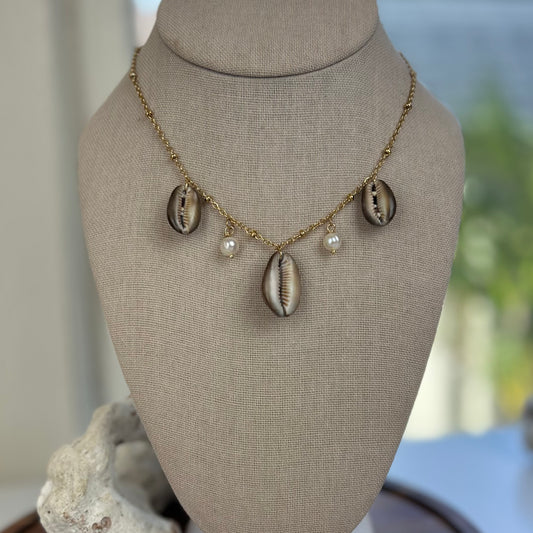 Cowrie Shell & Pearl Drop Pendant Necklace