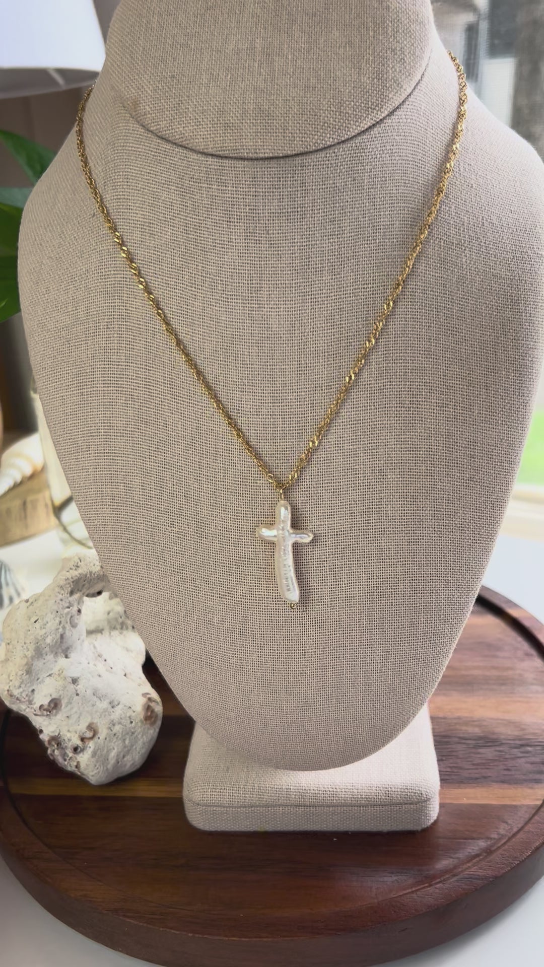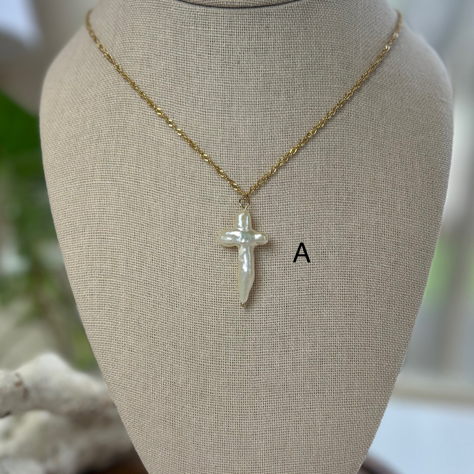 Simple yet elegant pendant necklace featuring a baroque pearl formed cross! Fluid form shape with naturally formed imperfections. On an 18k gold plated stainless steel dainty twist chain. Approximately 16-18 inches in total length including lobster clasp and extender. Choose your cross!