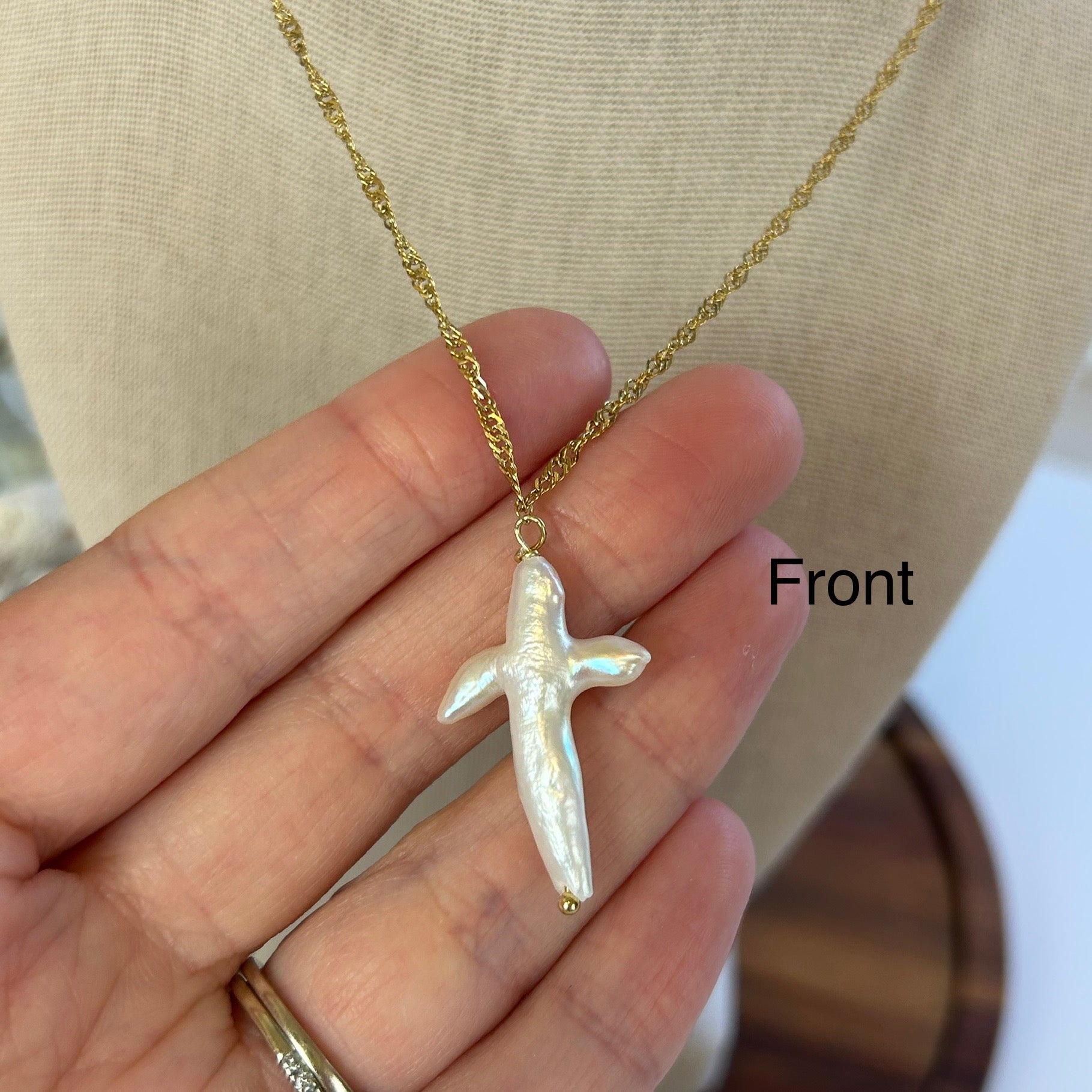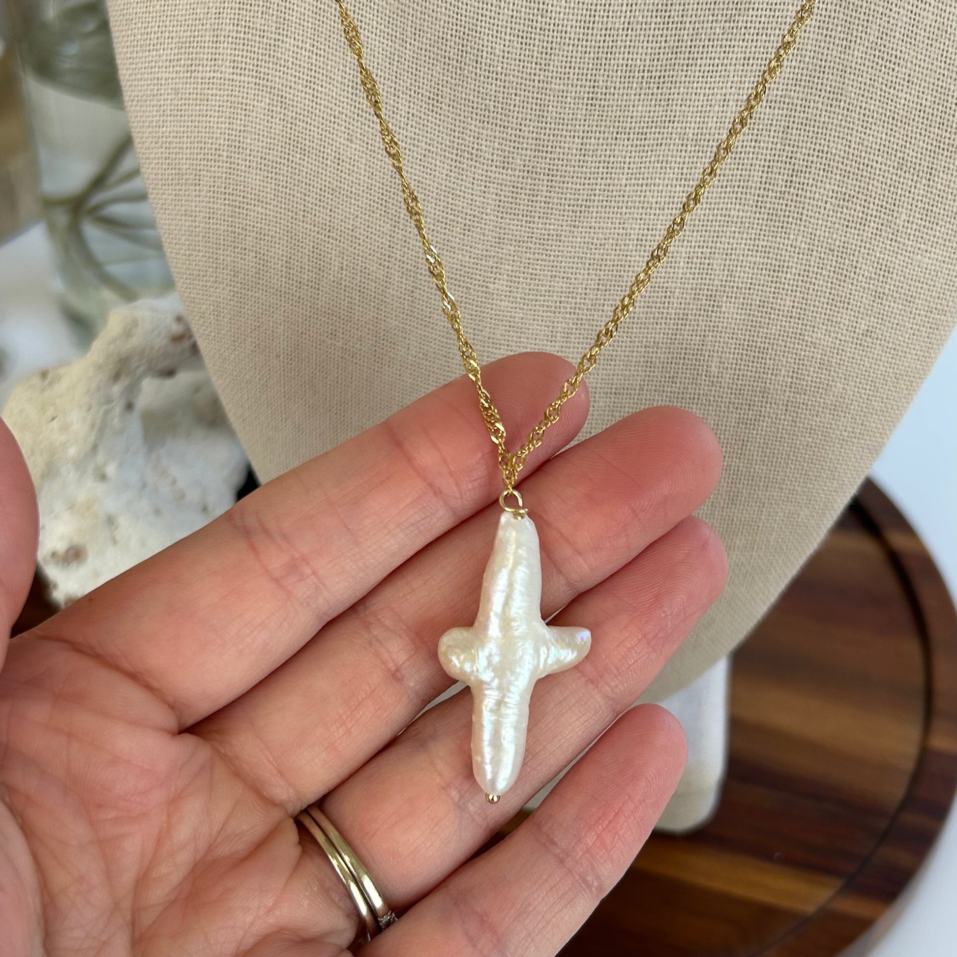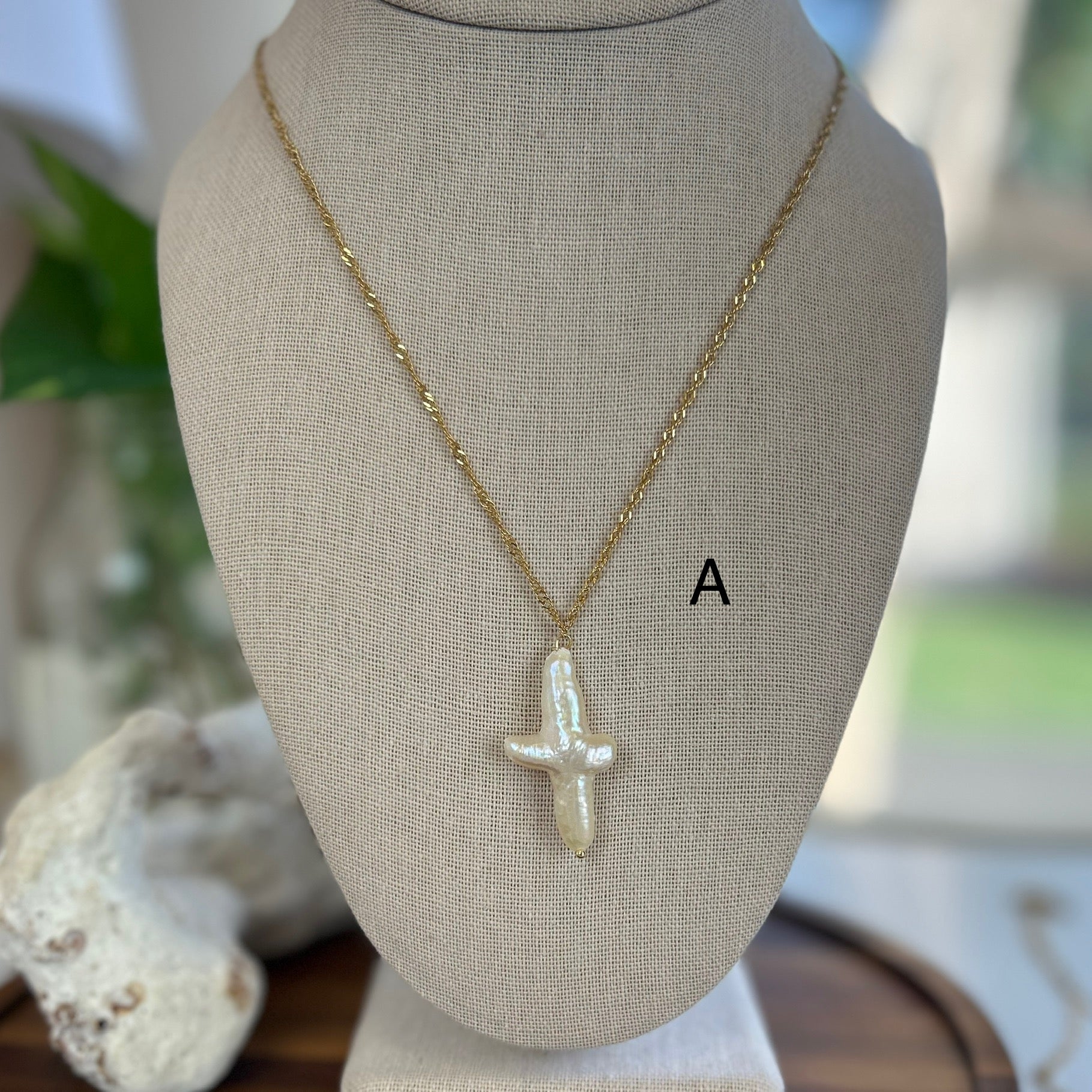 Simple yet elegant pendant necklace featuring a baroque pearl formed cross! Fluid form shape with naturally formed imperfections. On an 18k gold plated stainless steel dainty twist chain. Approximately 18-20 inches in total length including lobster clasp and extender. Choose your cross!