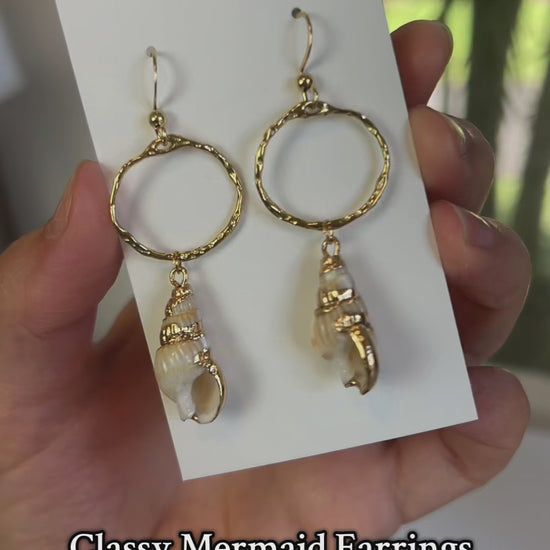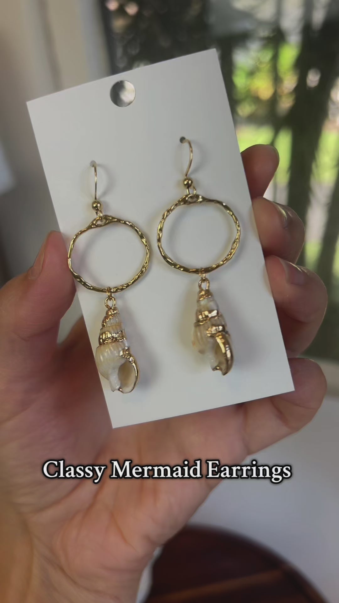 Handmade in hawaii! Add a subtle hint of mermaid elegance to your summer wardrobe with these drop earrings! Natural twist beige seashells with gold accenting. Open bezel. 18k gold plated, stainless steel elements - durable and tarnish resistant! Comes with clear backings