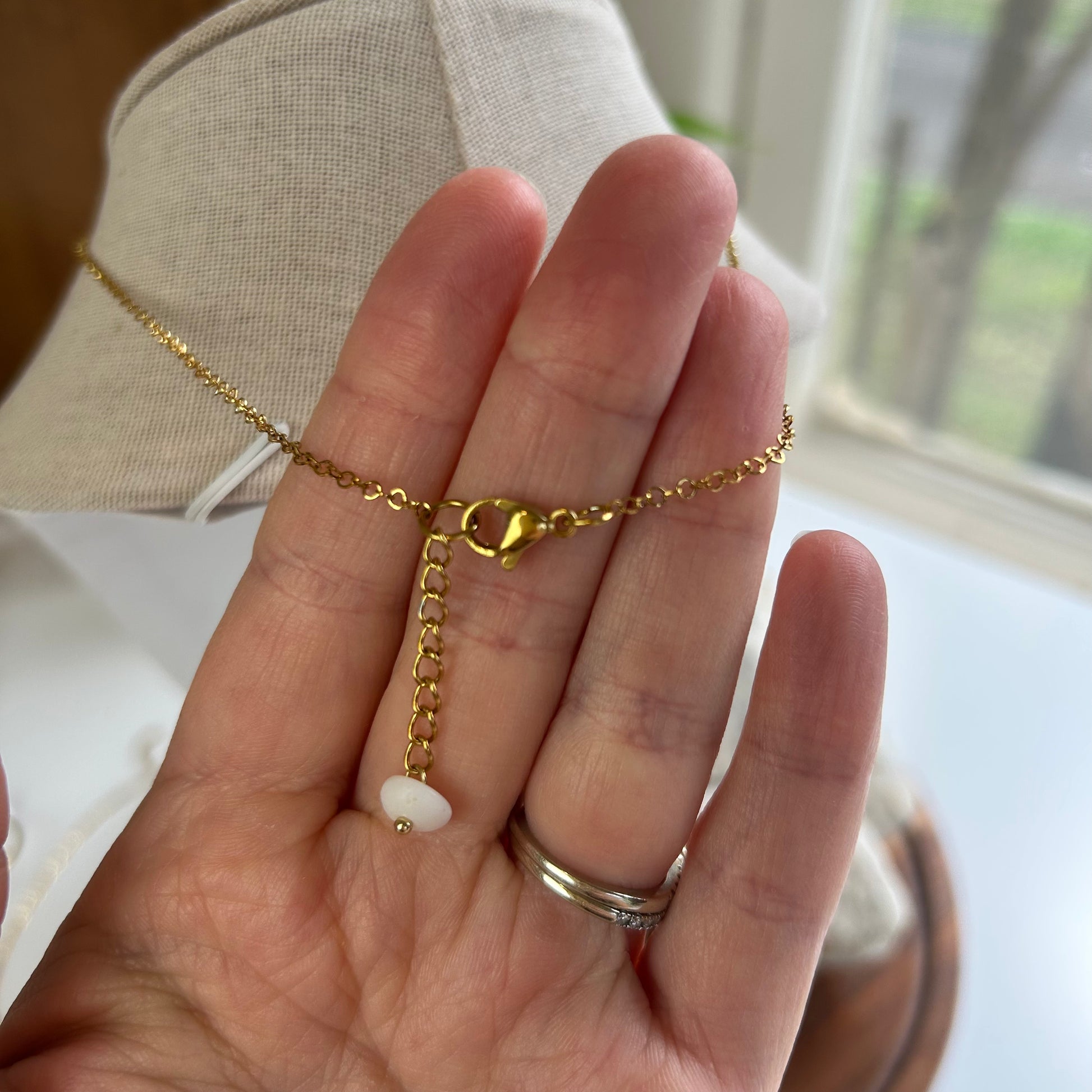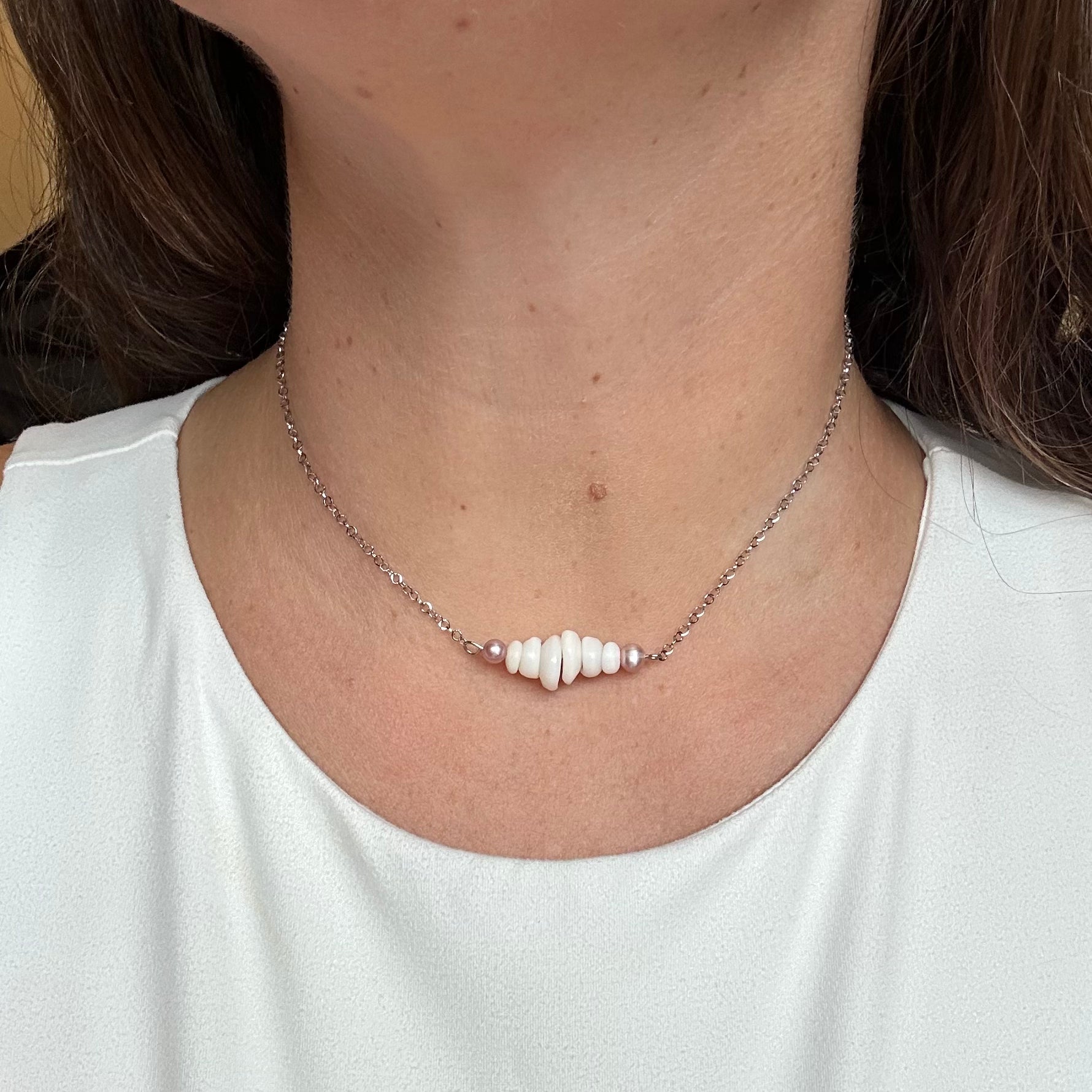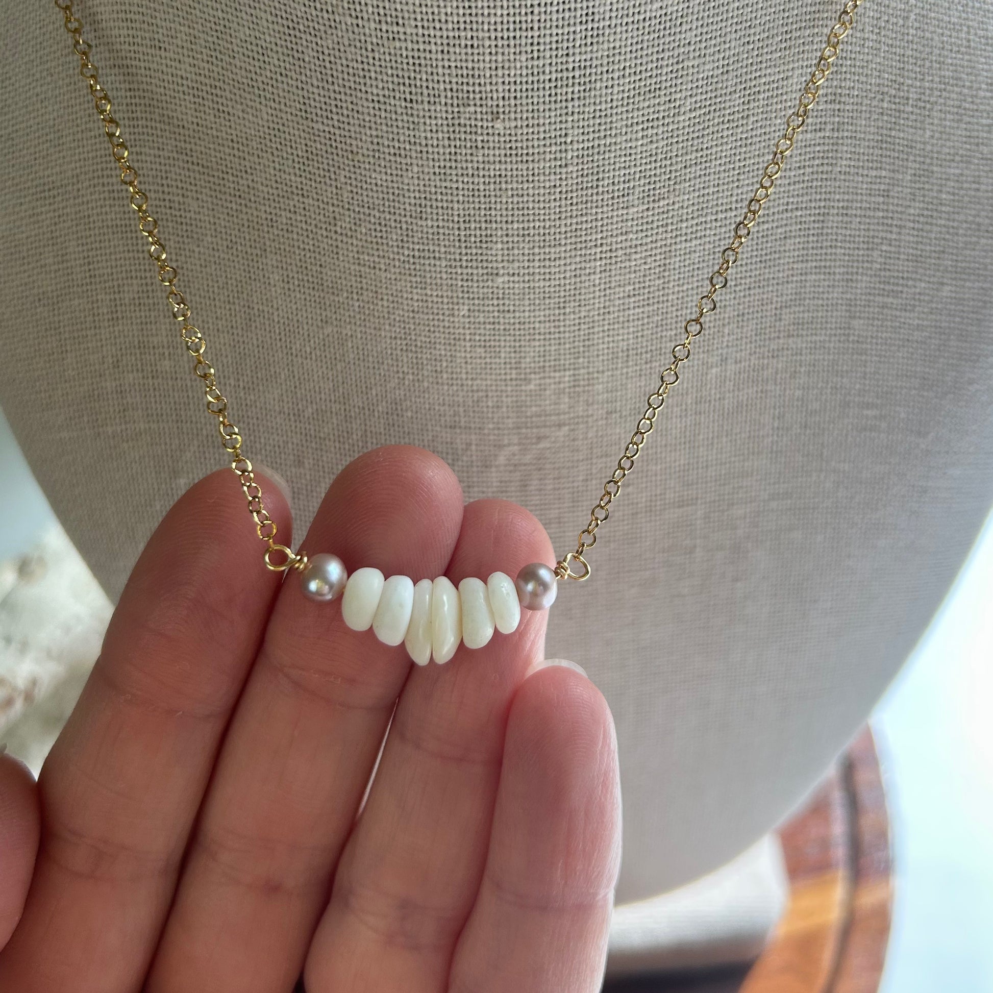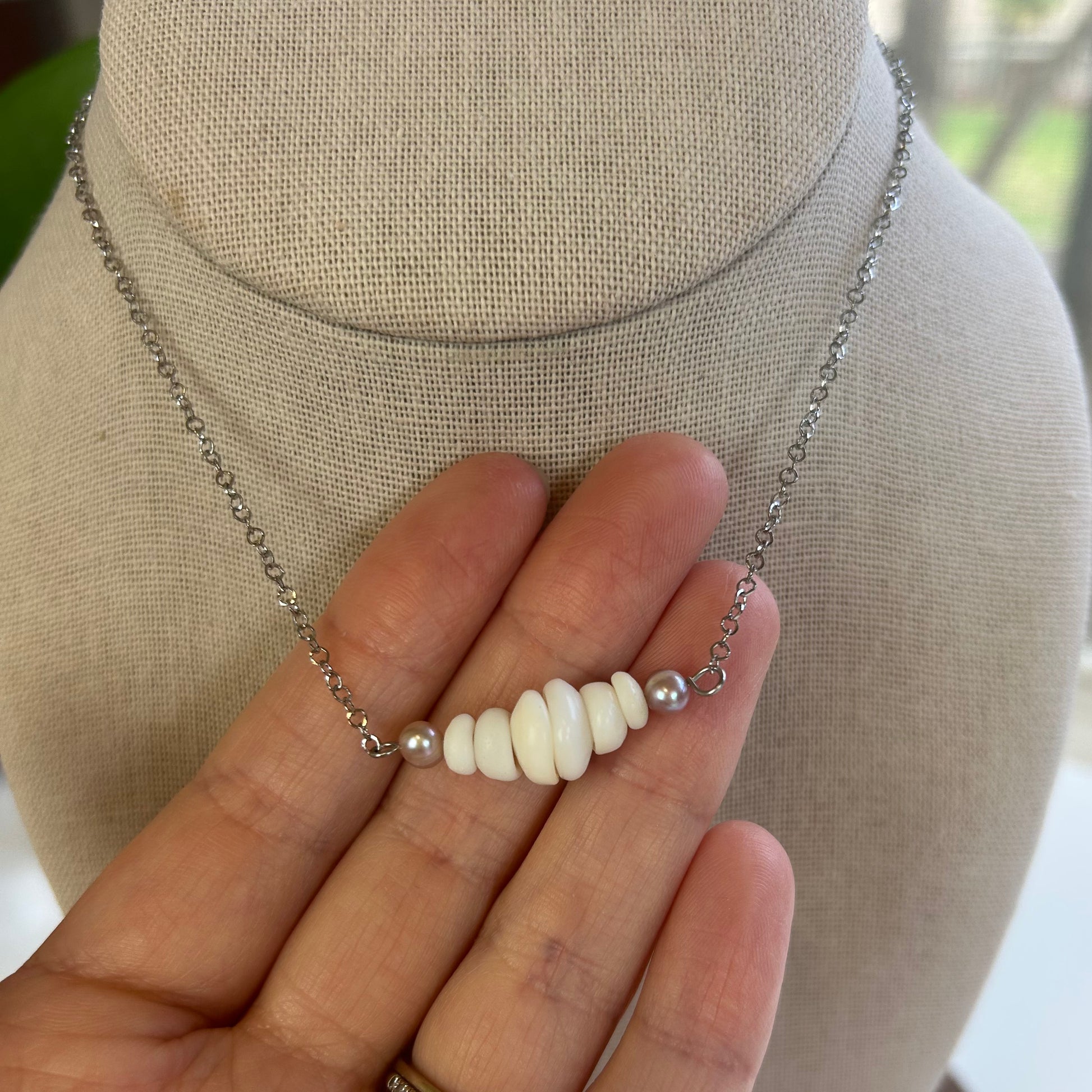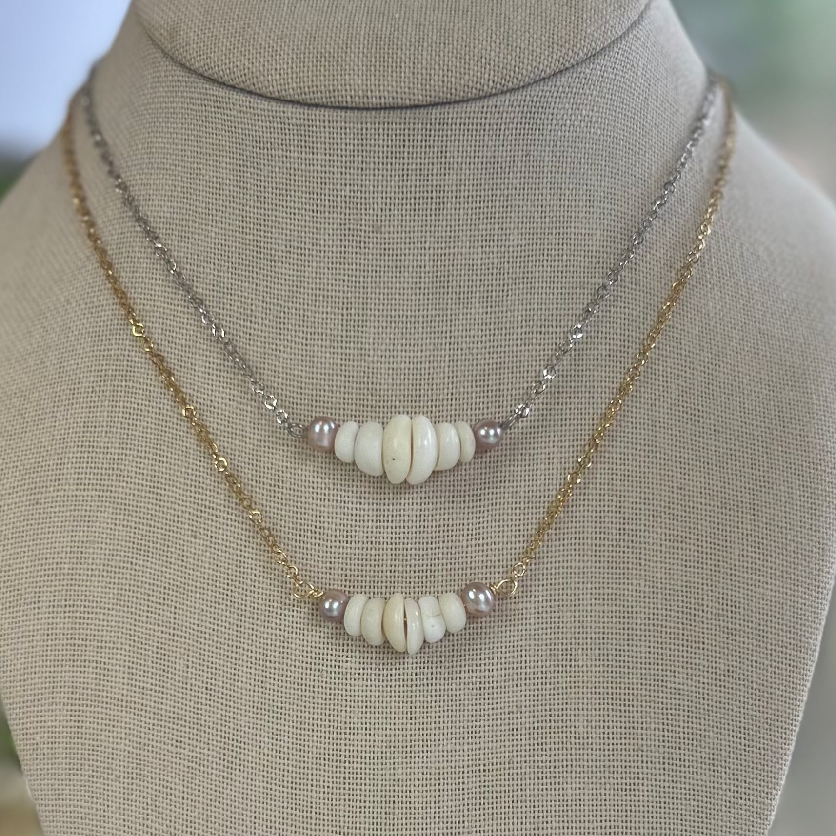 Adorable little necklace featuring mini puka shells and purple toned freshwater pearls!