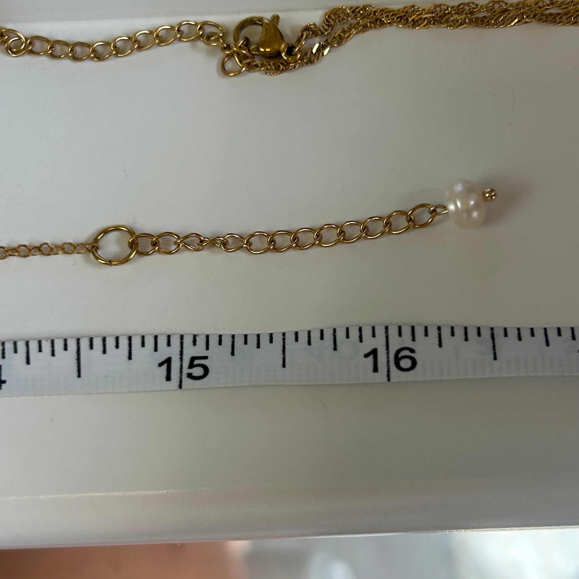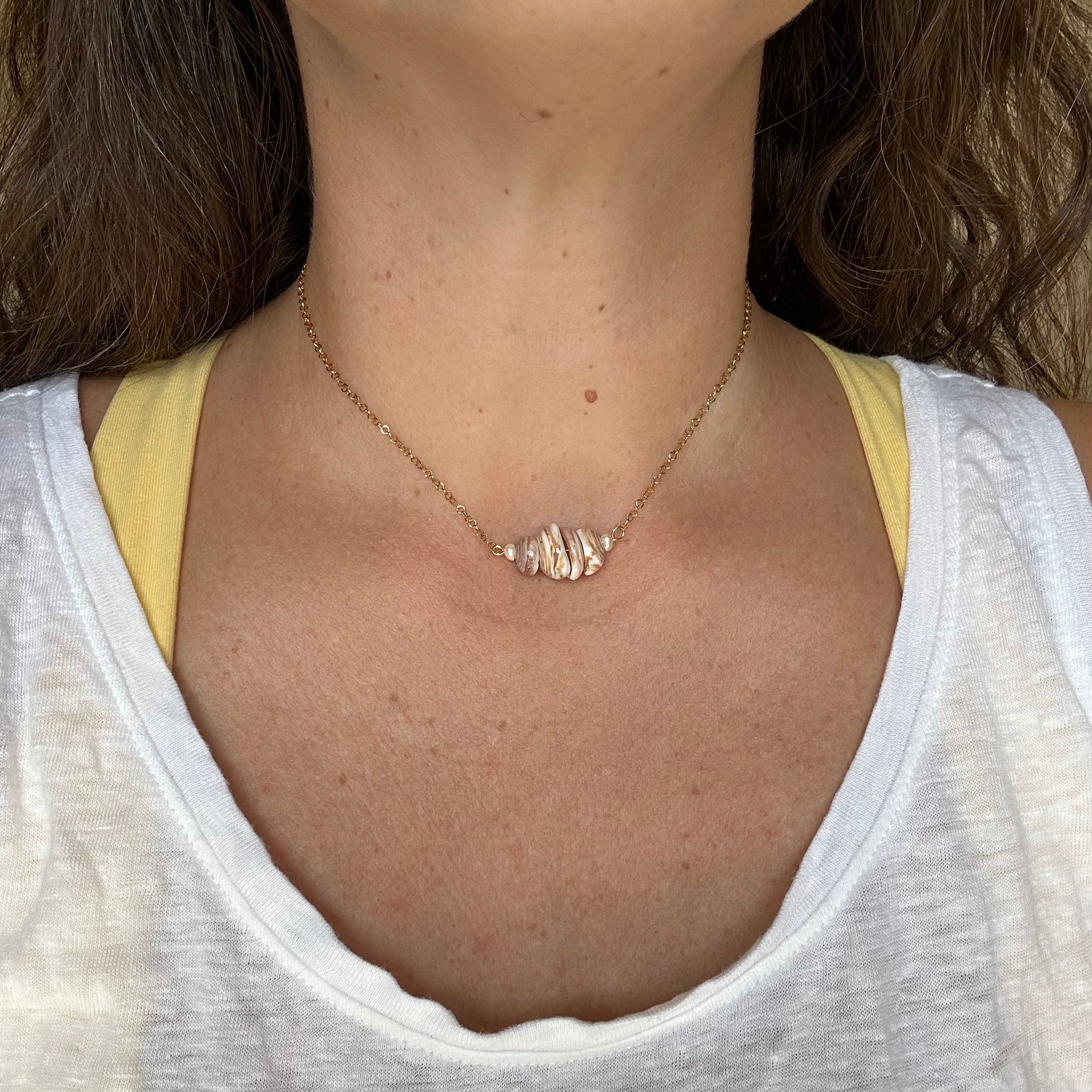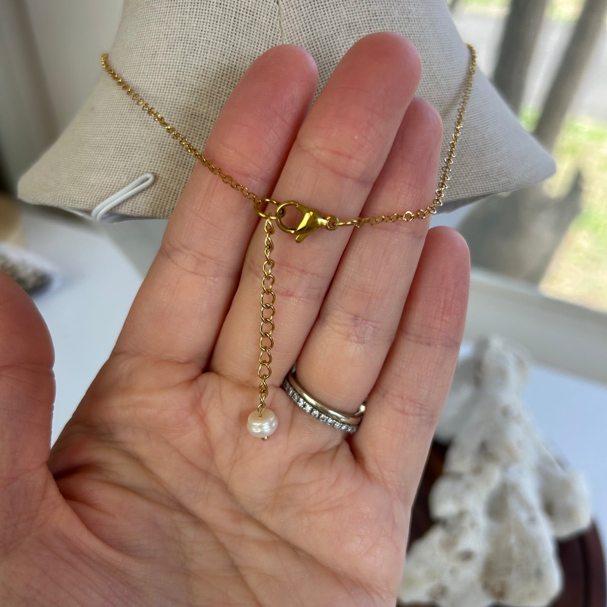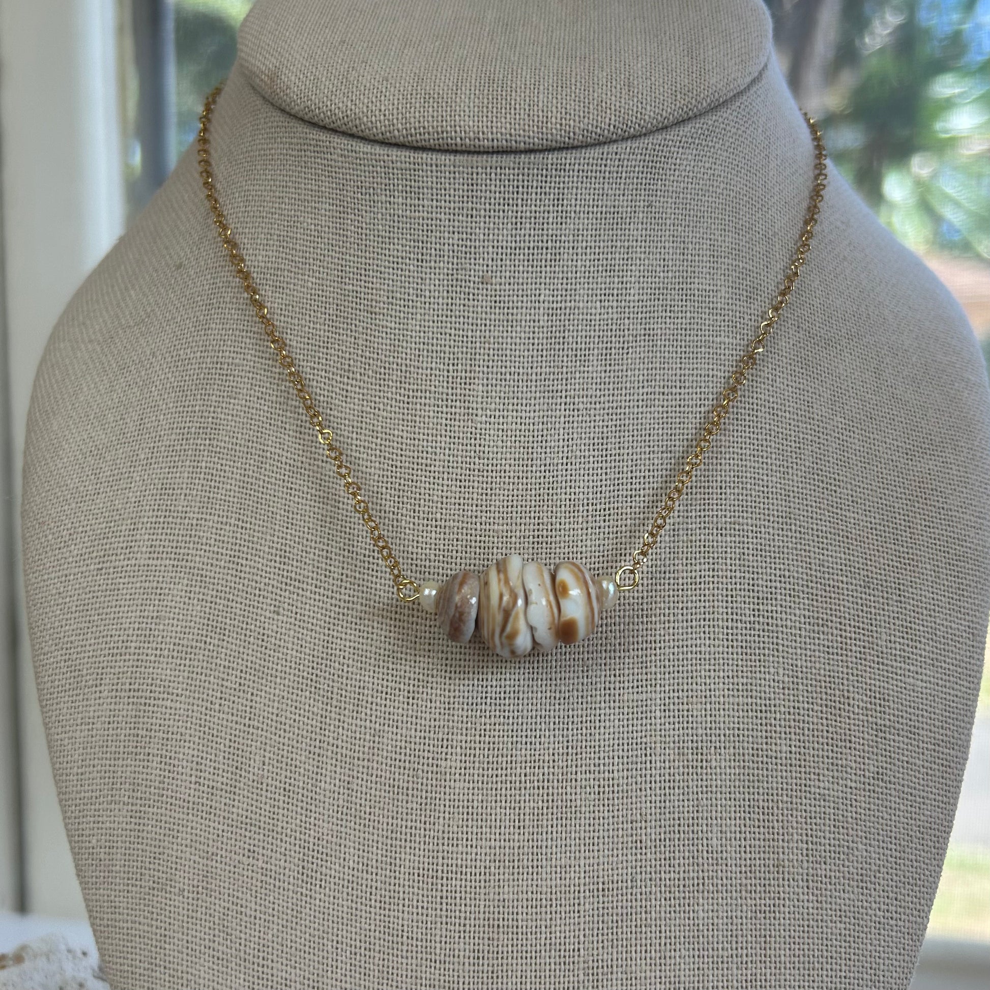 A dainty little puka shell cluster to add charm to any outfit! Four cinnamon brown puka shells with a mini freshwater pearl on either end. 18k gold plated, stainless steel - circle link chain. *short, almost choker length. Approximately 14.5 to 16.5 inches in adjustable length including lobster claw clap and extender! Finished with a freshwater pearl!
