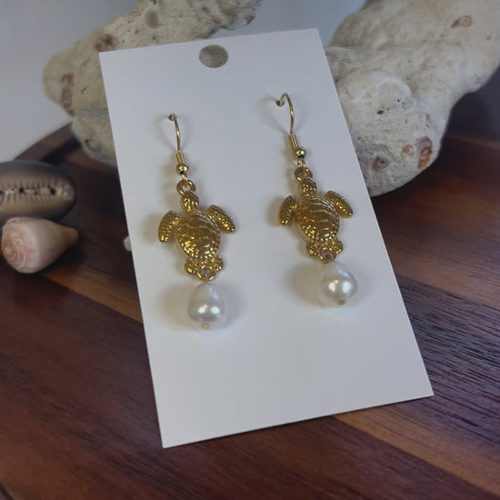 Adorable pair of earrings in honor of the Hawaiian Honu (seaturtle). Paired with freshwater pearls. 18k gold plated, stainless steel filled elements. Clear backings.