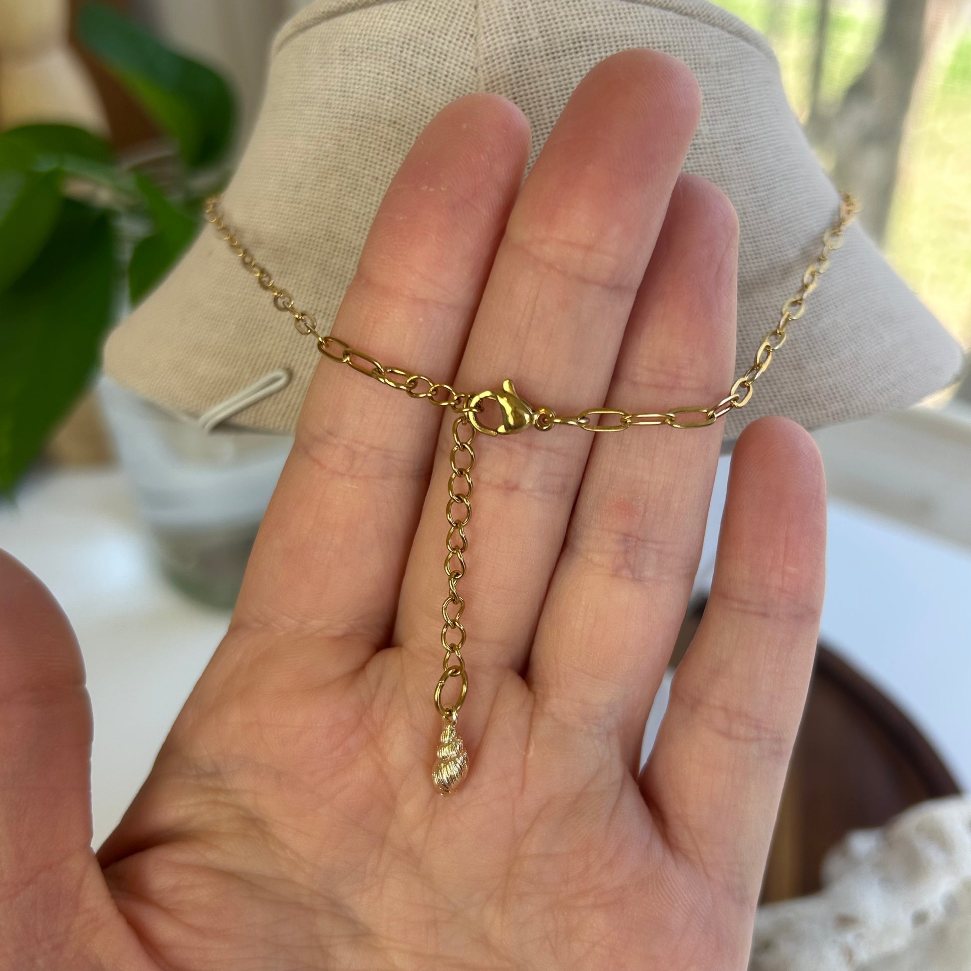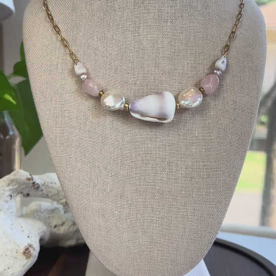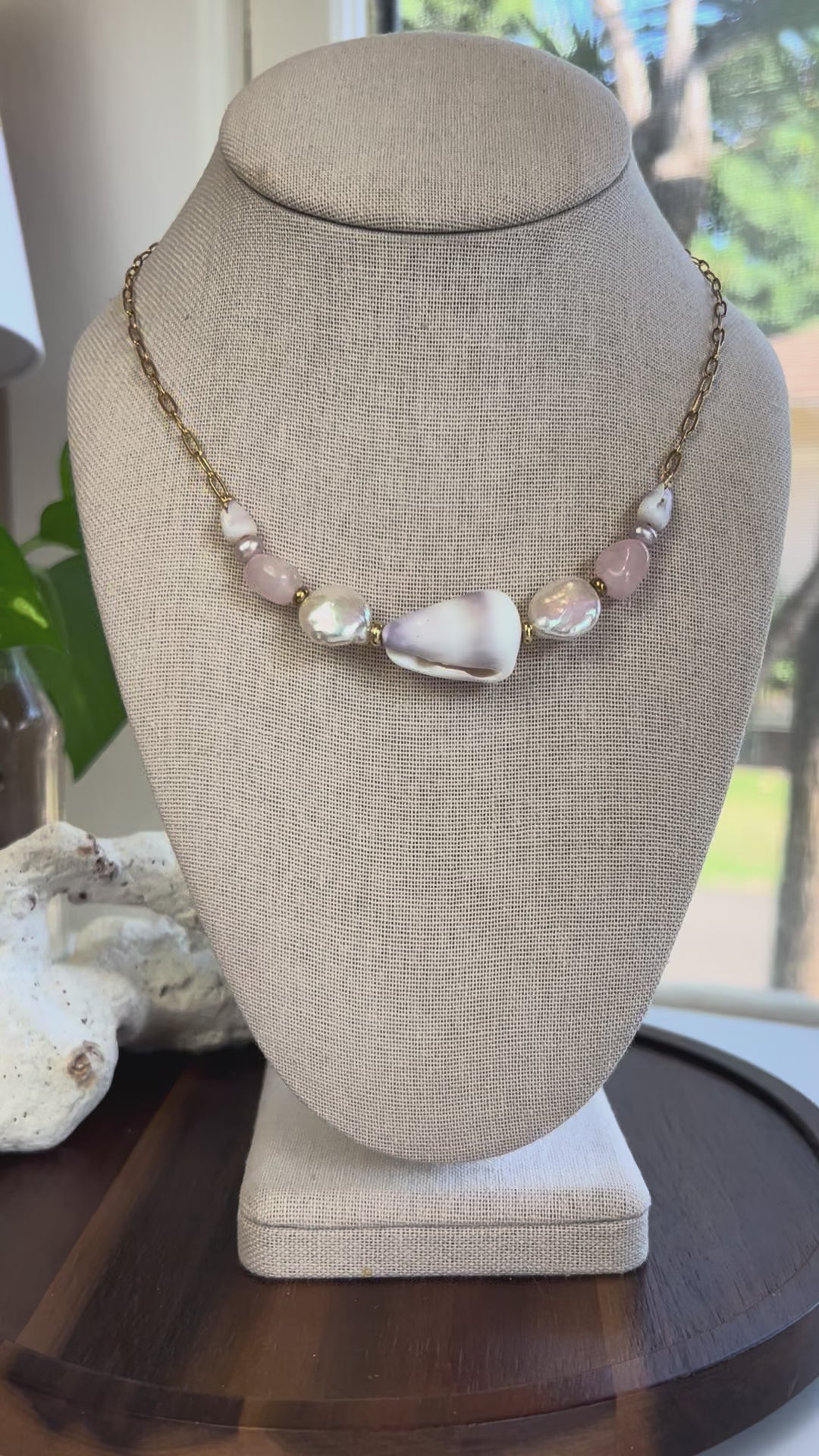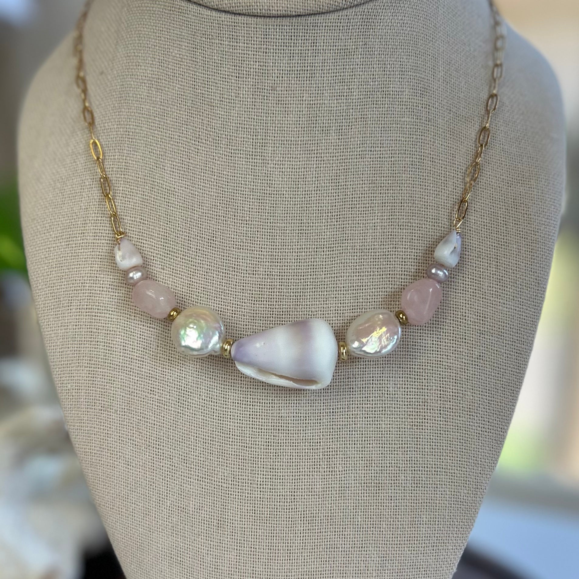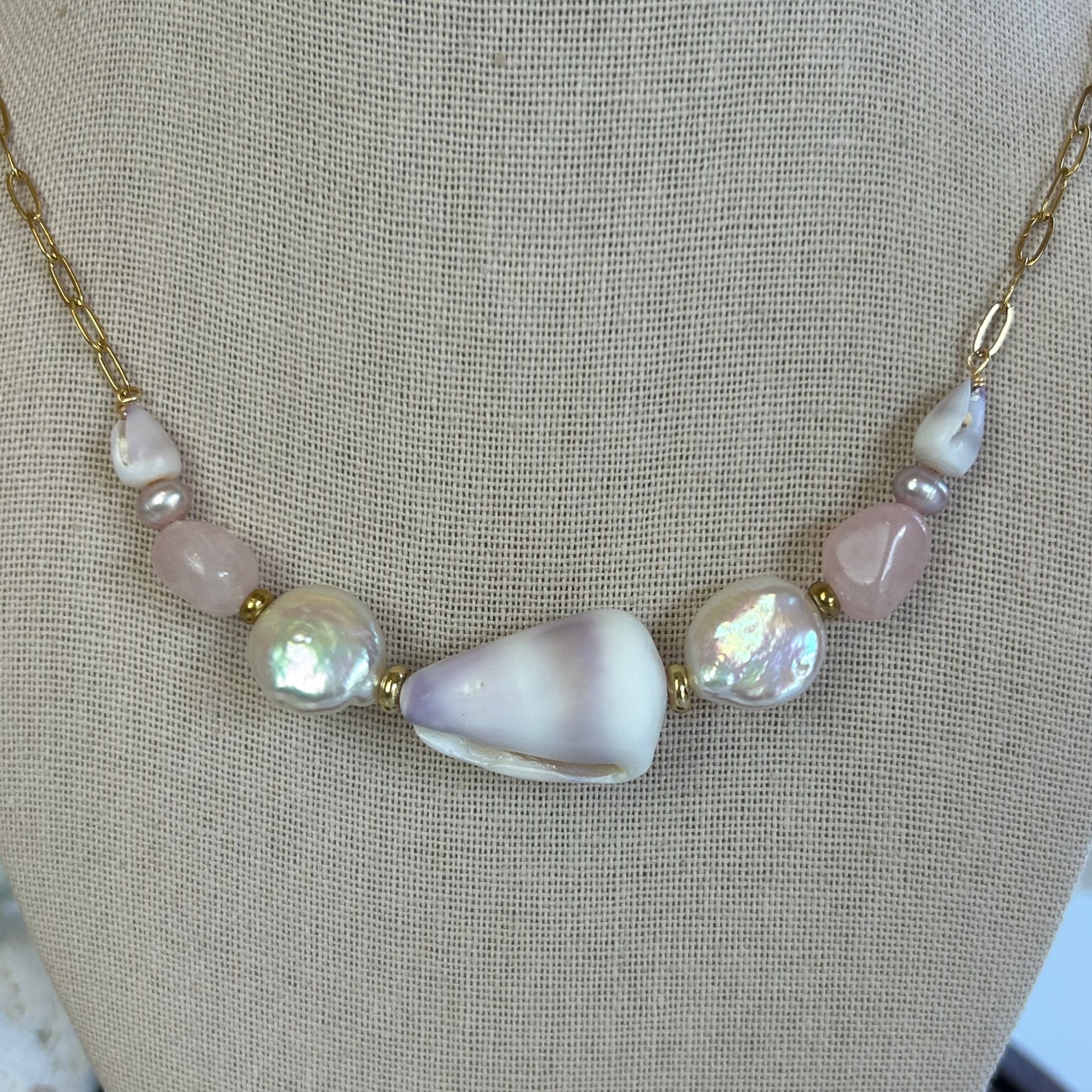 Stunningly lovely island style necklace featuring a center pastel purple toned cone Shell. Mother of pearl coins, rose quartz stones, purple toned freshwater pearls and mini cone shells! On a high quality 18k gold plated, stainless steel filled chain (durable and tarnish resistant) Approximately 16-17.5 inches in adjustable length including lobster clasp and extender. Shells/pearls are on a wire that may be adjusted.