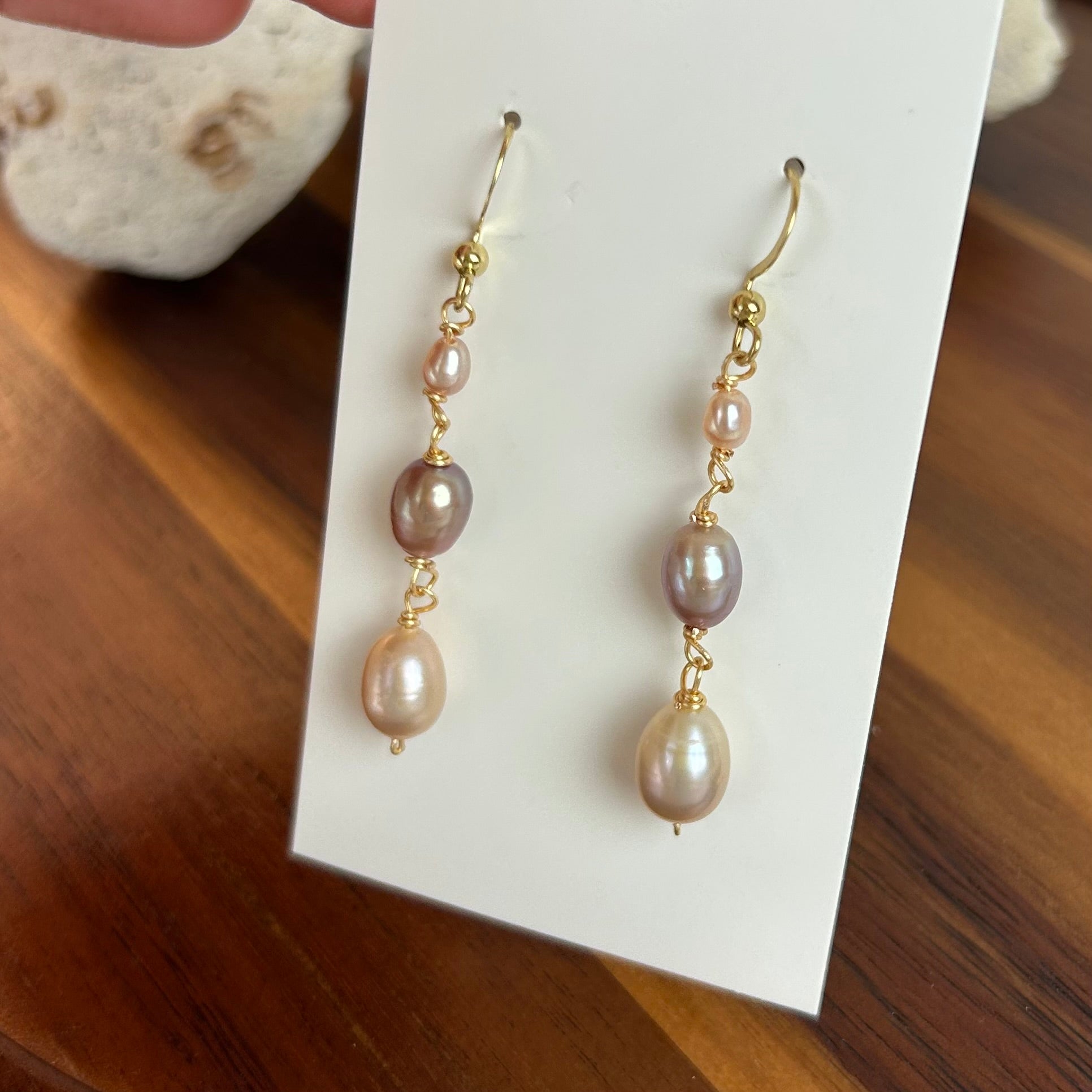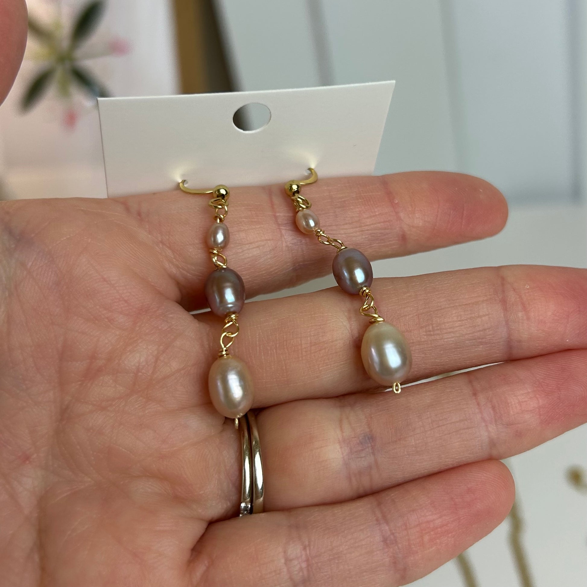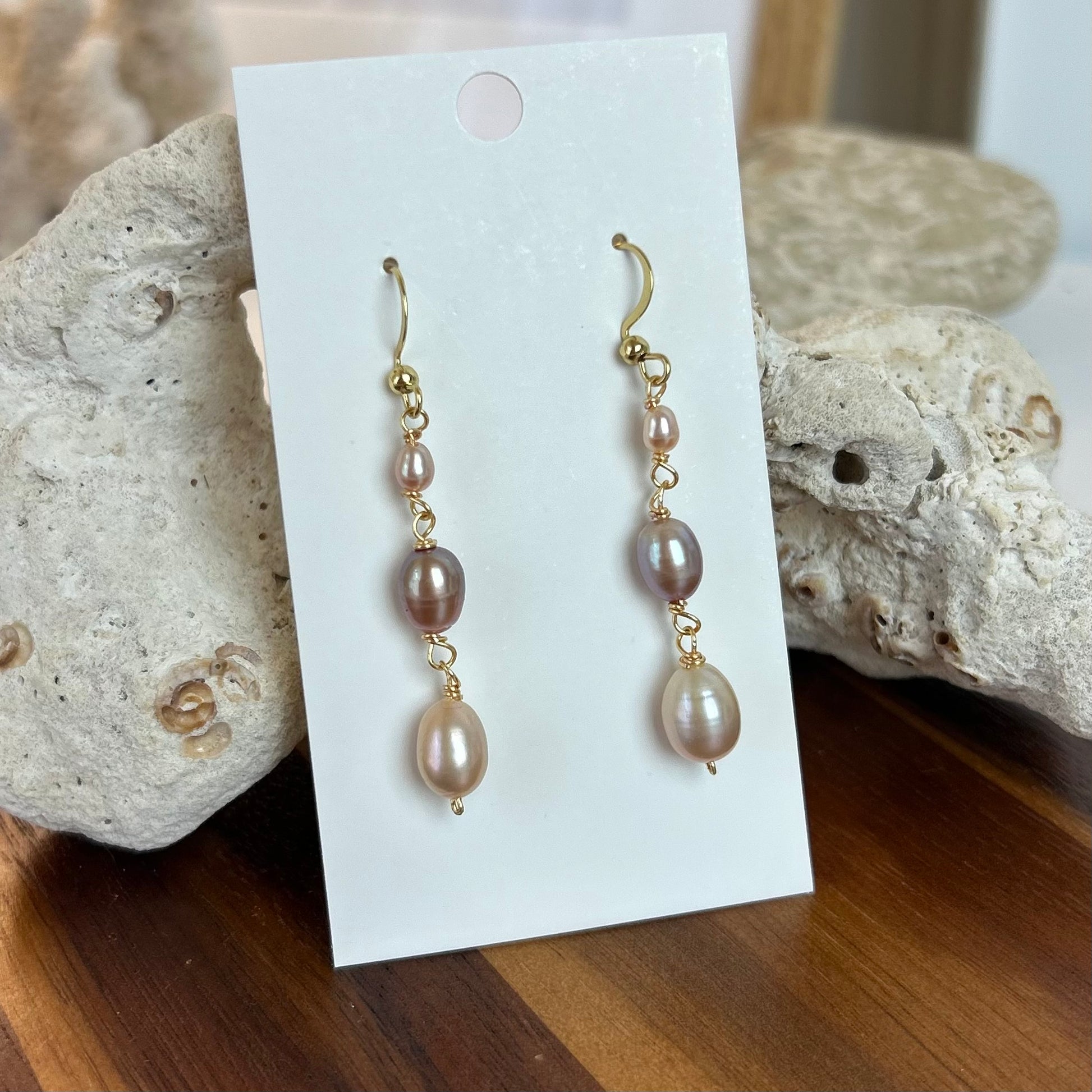 Triple drop design with lavender freshwater pearls in shades of pink and purples! 18k gold plated stainless steel materials, durable and tarnish resistant!
