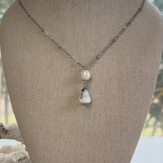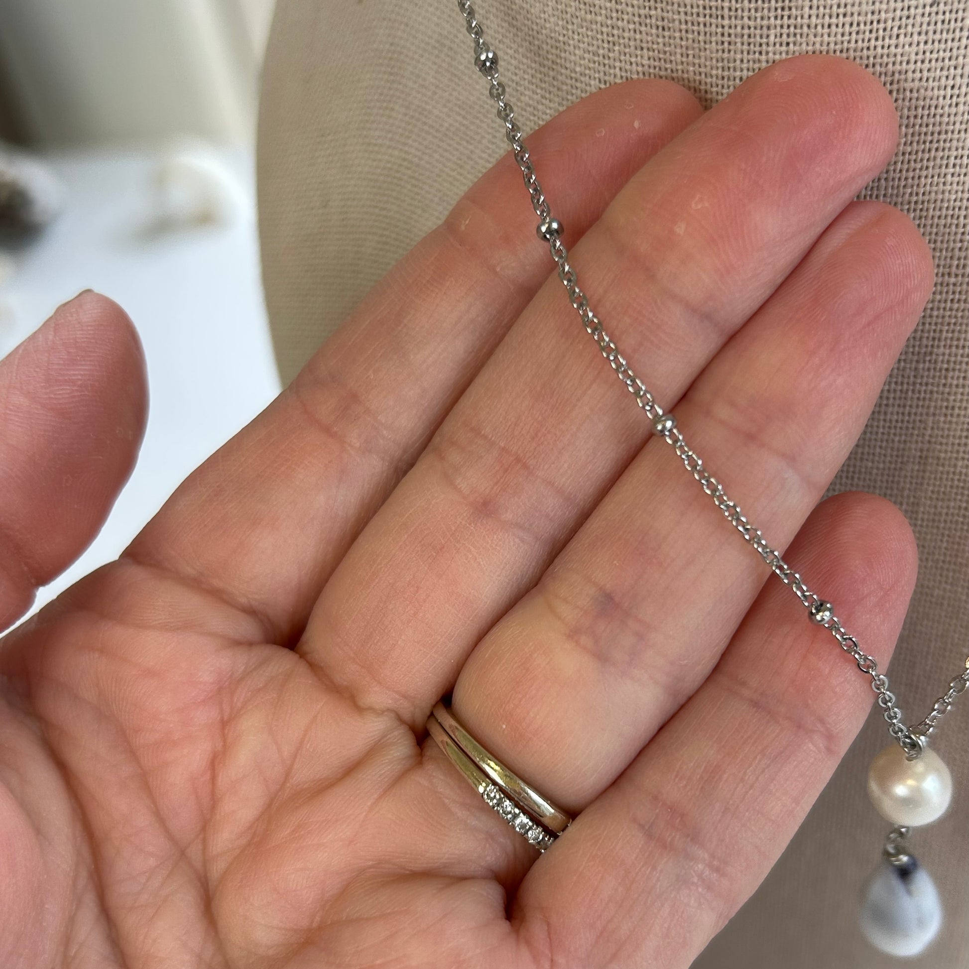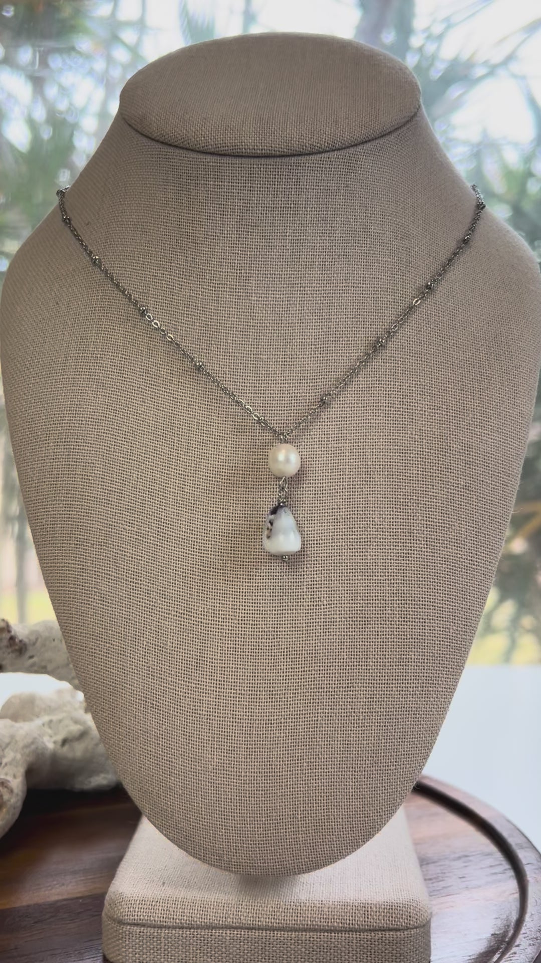 Handmade in Hawaii! Lovely little cone shell in gray/blue tones. Freshwater pearl drop accent! On a stainless steel silver toned chain with satellite beads (durable and tarnish resistant) Approximately 16.5 to 18 inches in total adjustable length including lobster claw clasp and extender. Finished with a mini freshwater pearl!