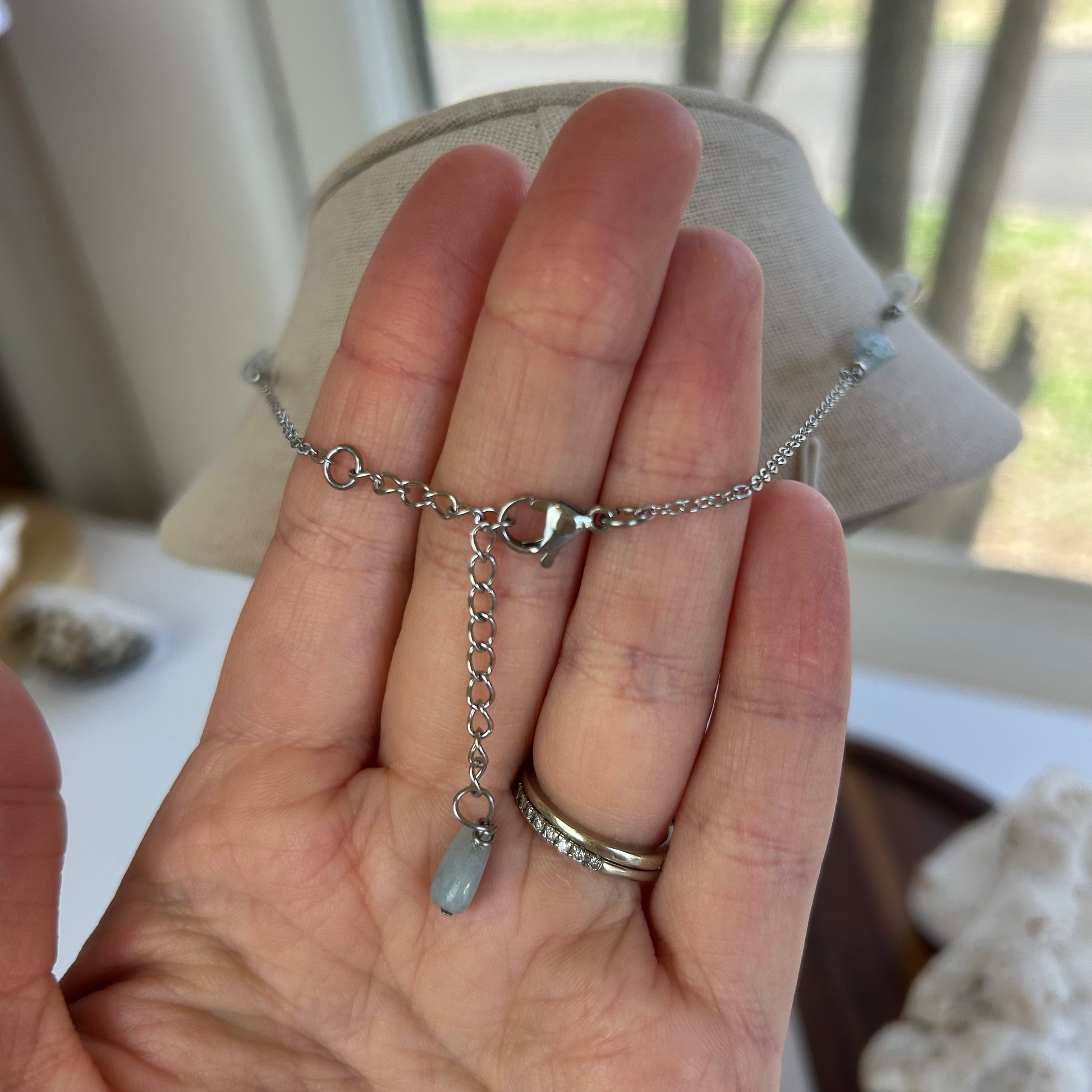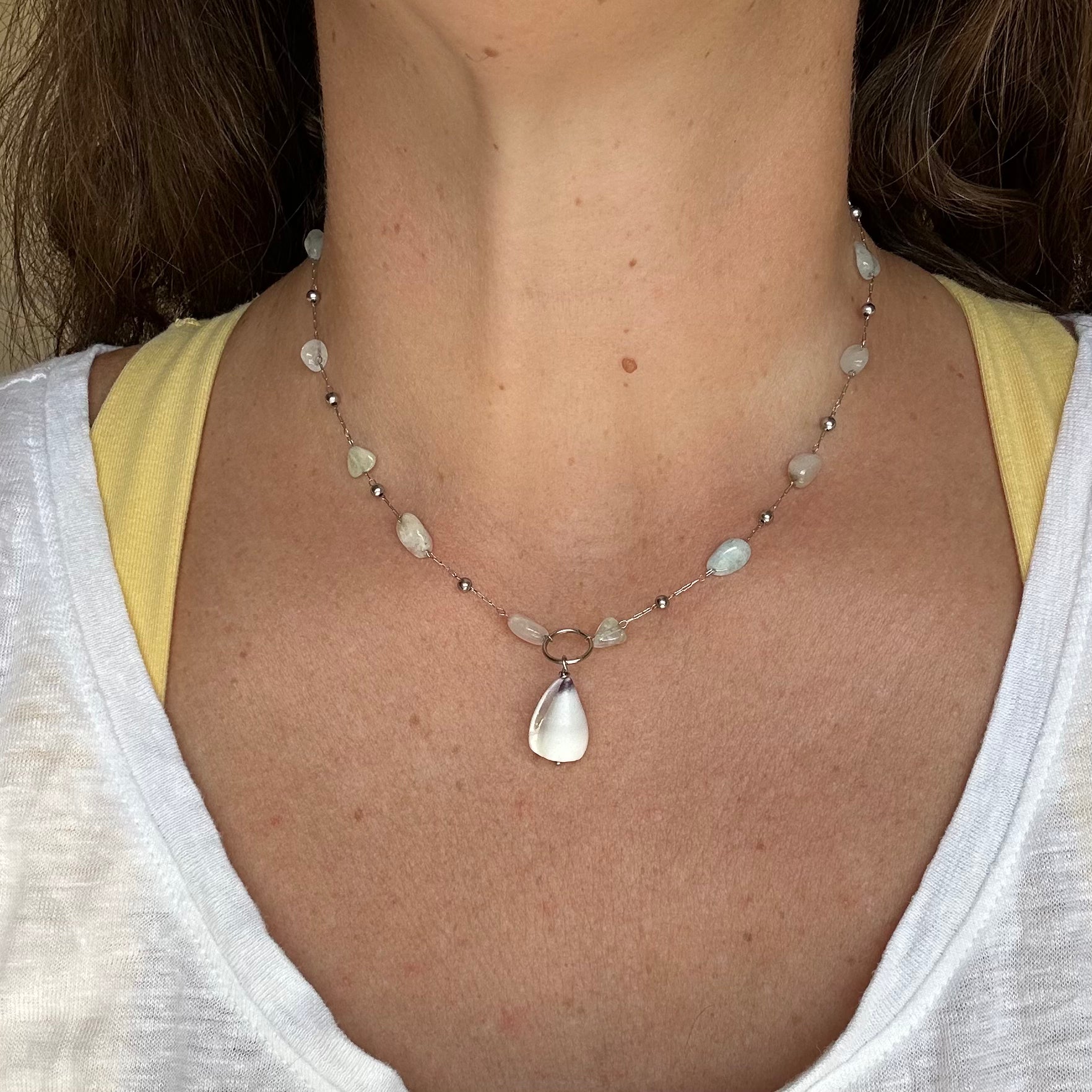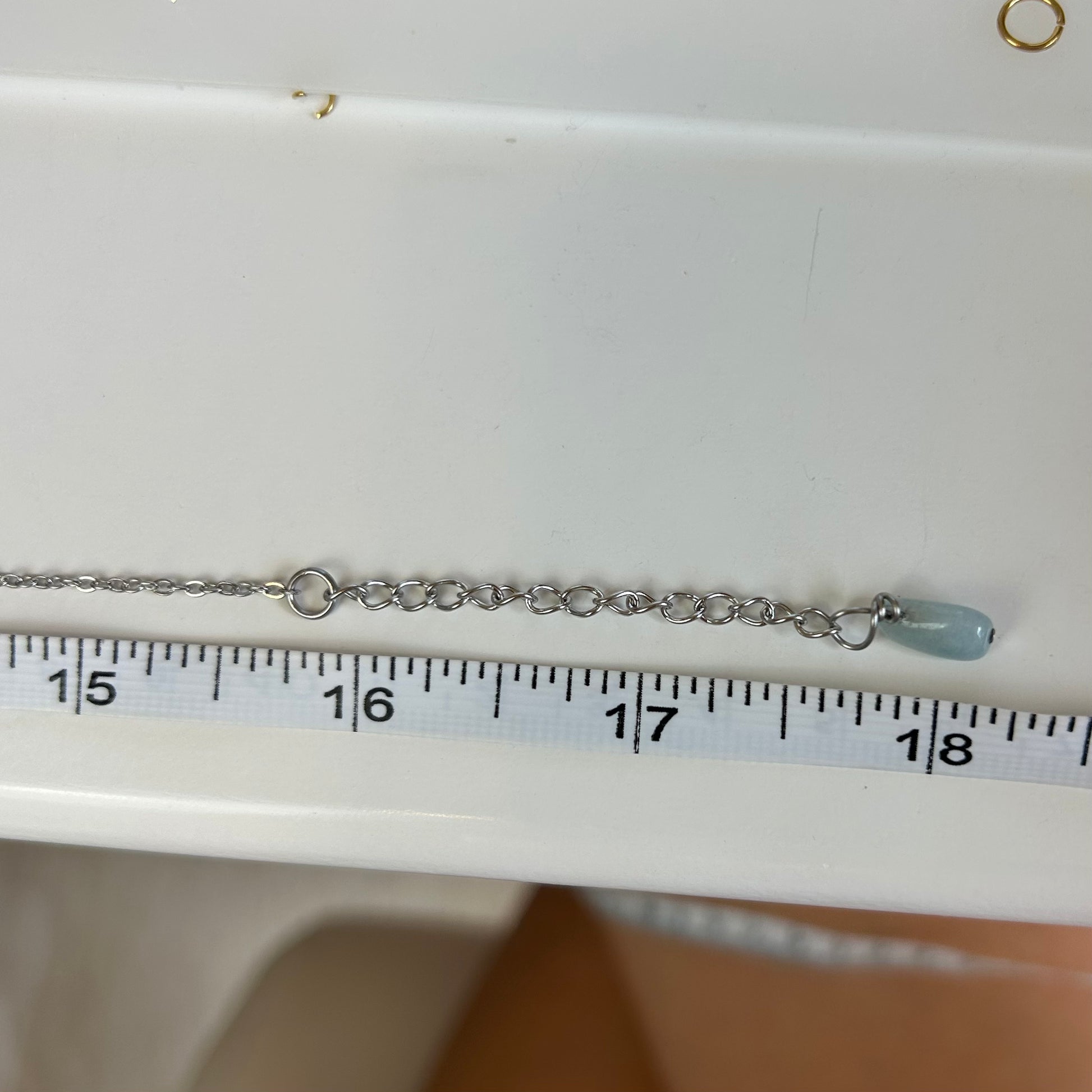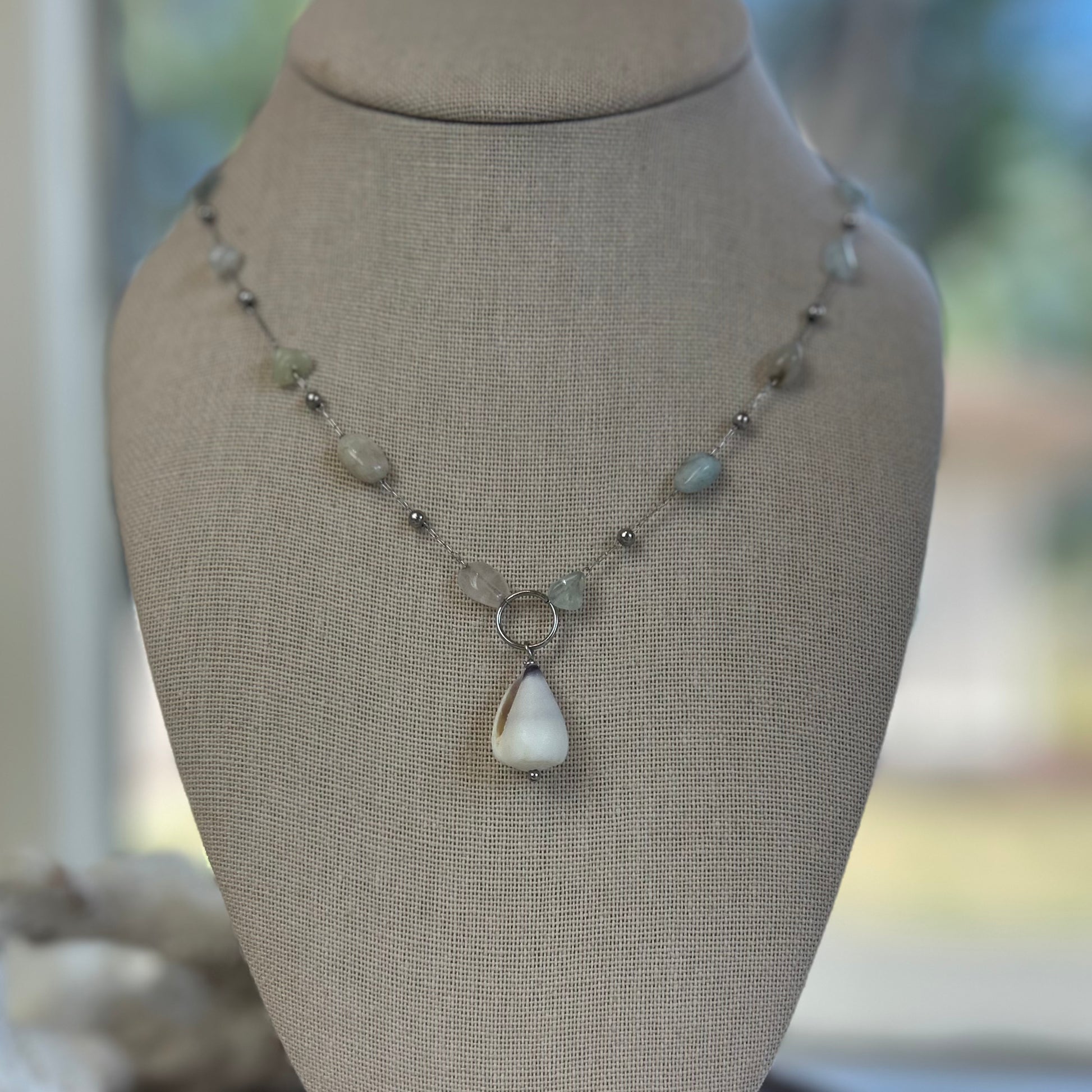 Lovely little necklace featuring a mix of natural stone in light, pastel tones! Silver toned stainless steel chain. One center natural cone shell! Approximately 16-18 inches in total adjustable length including lobster claw clasp and extender! New, unworn except for brief fit reference photo!