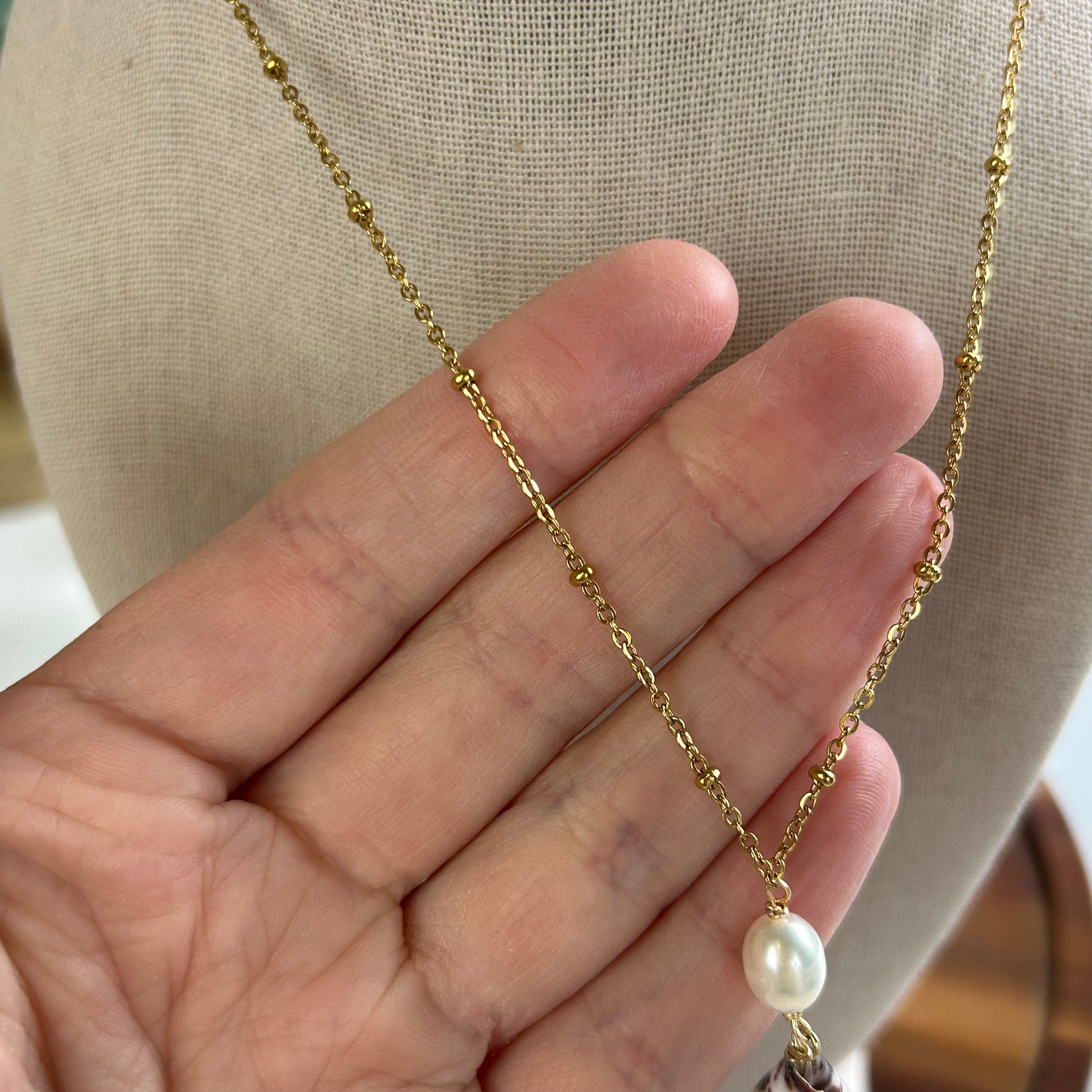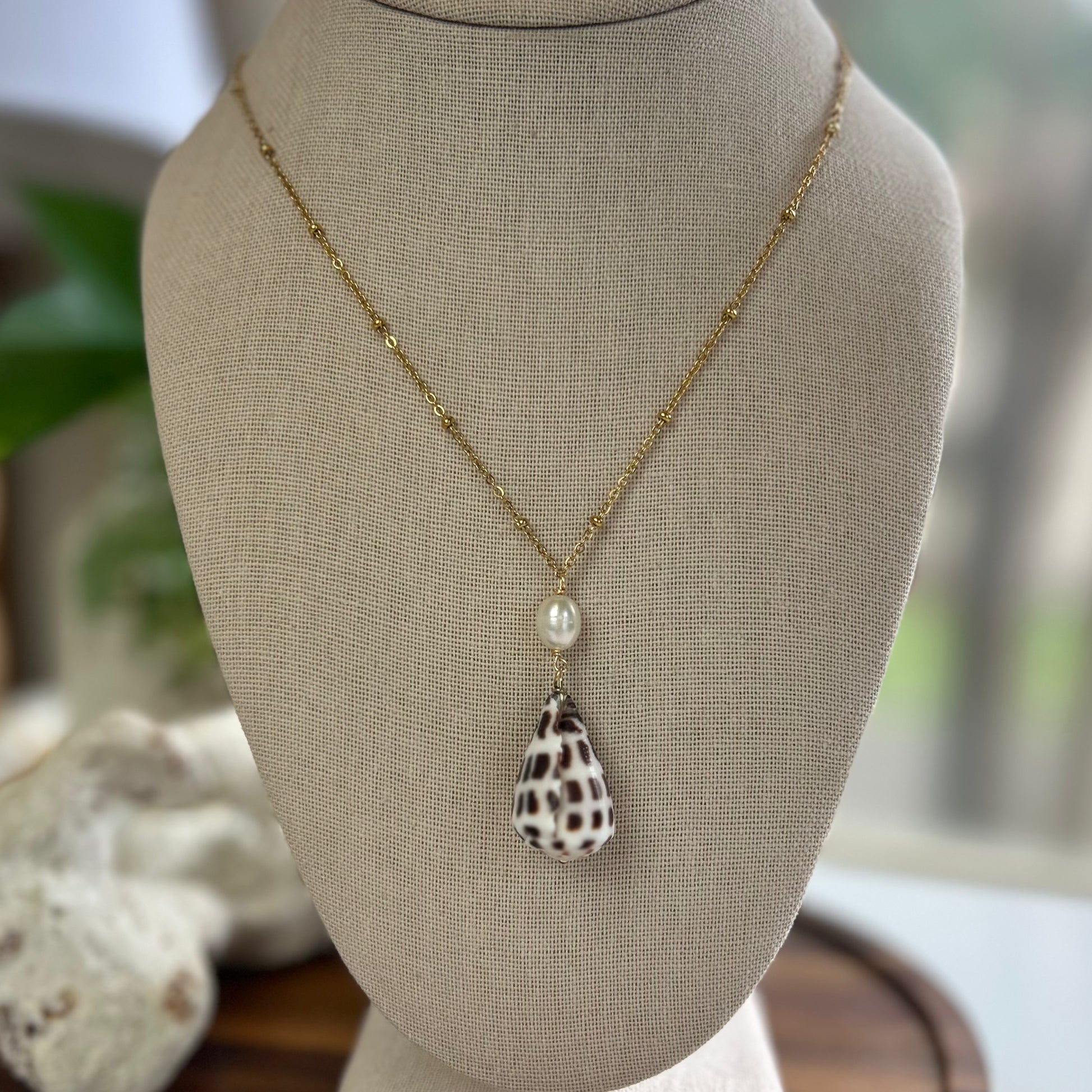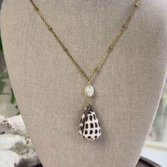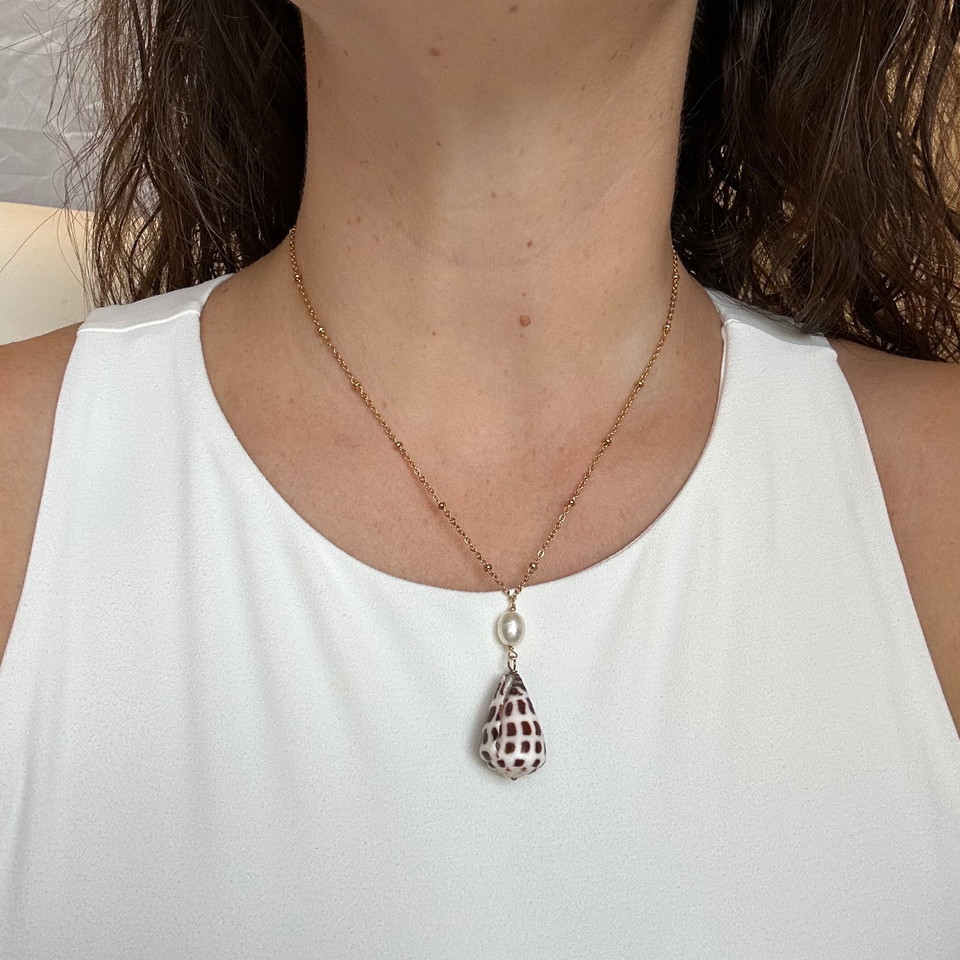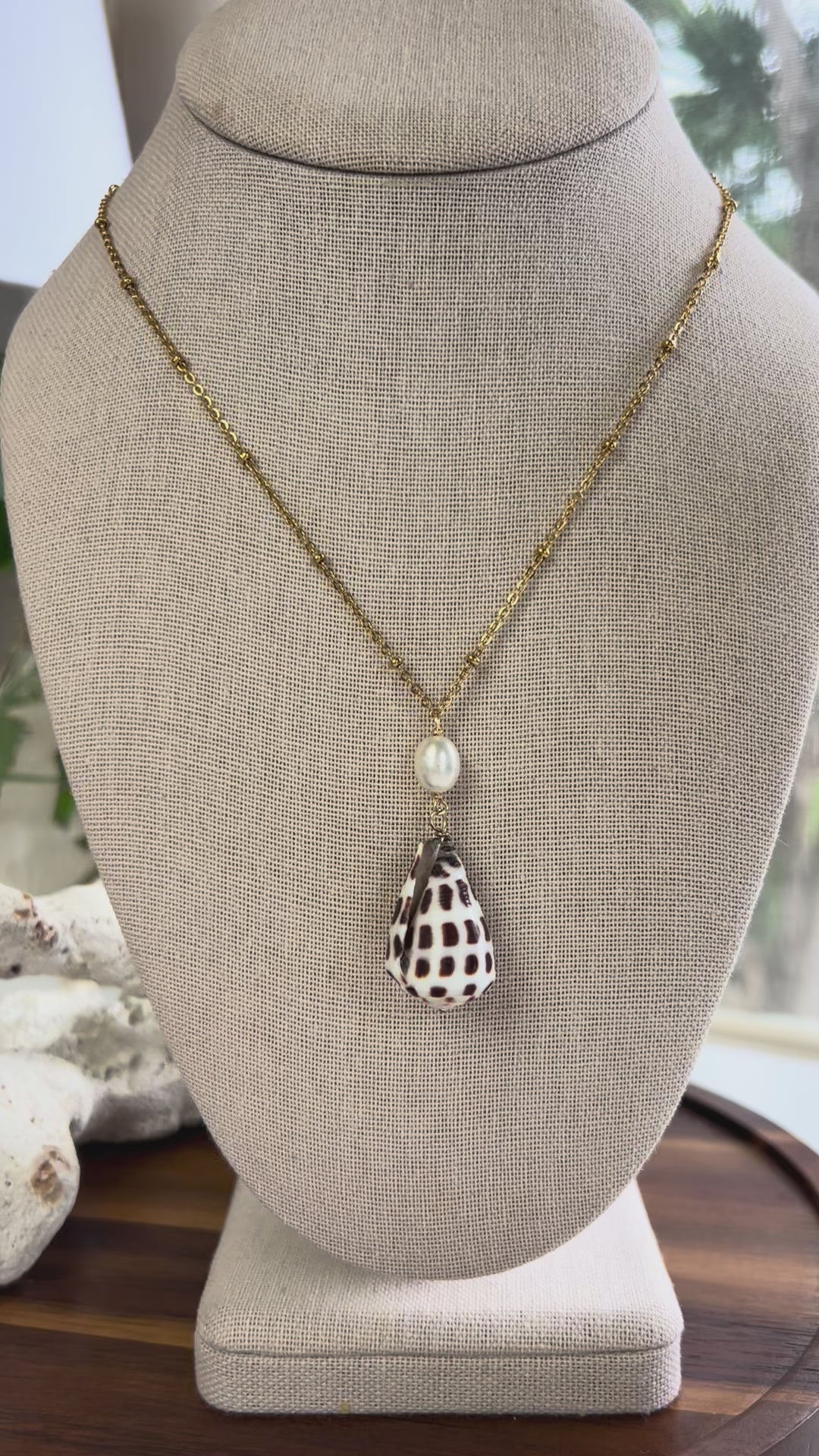 Pearl drop style necklace featuring a brown toned Hebrew cone shell and freshwater pearl! 18k gold plated chain with satellite beading detail. Approximately 17-18.5 inches in total adjustable length including lobster claw clasp and extender. New, unworn other than fit reference photos!