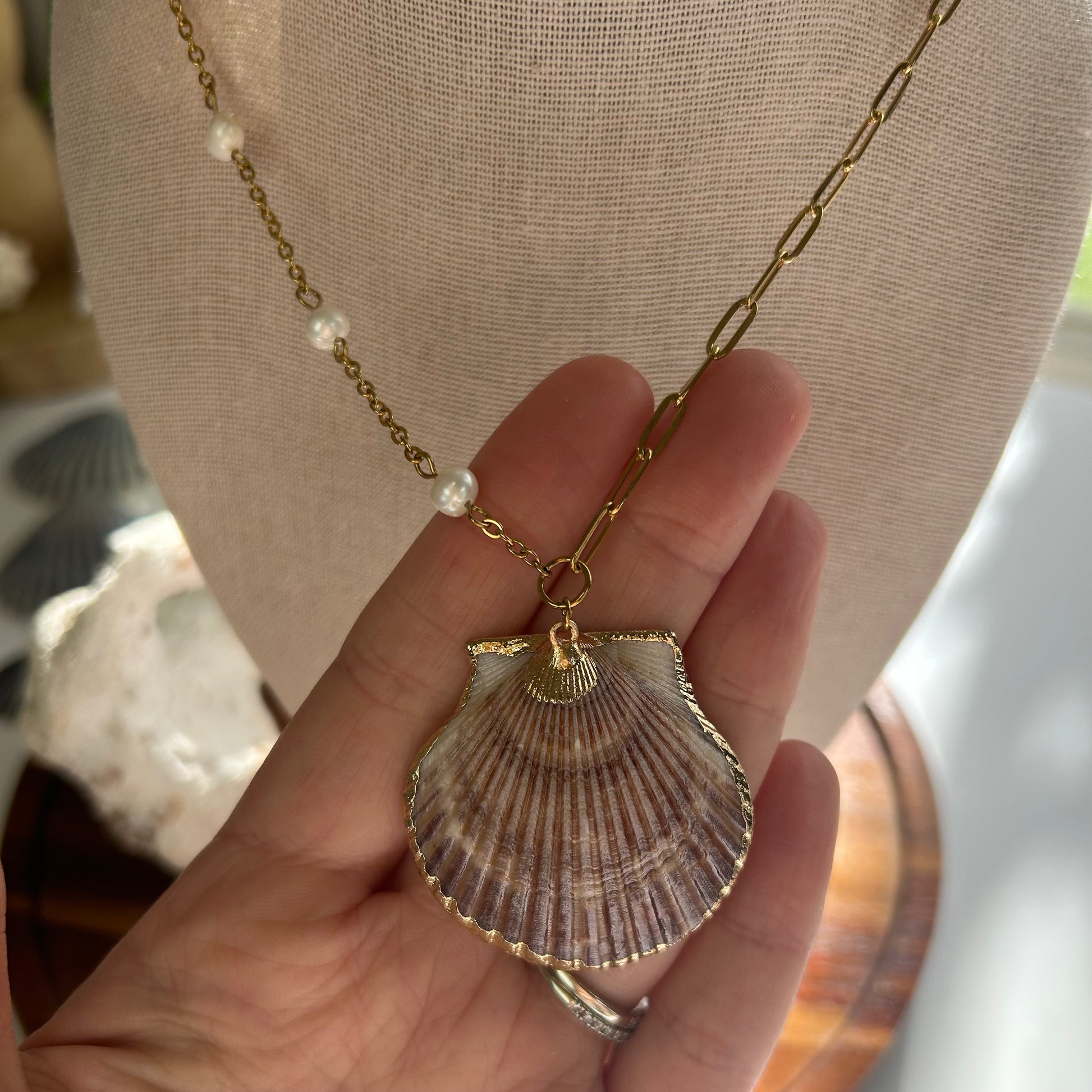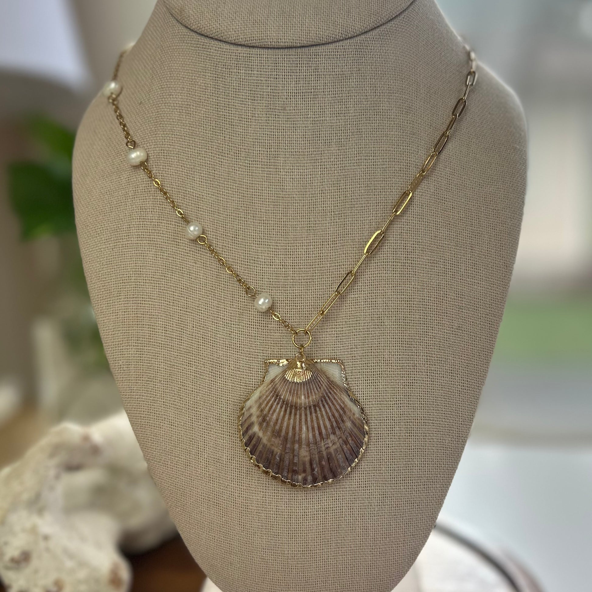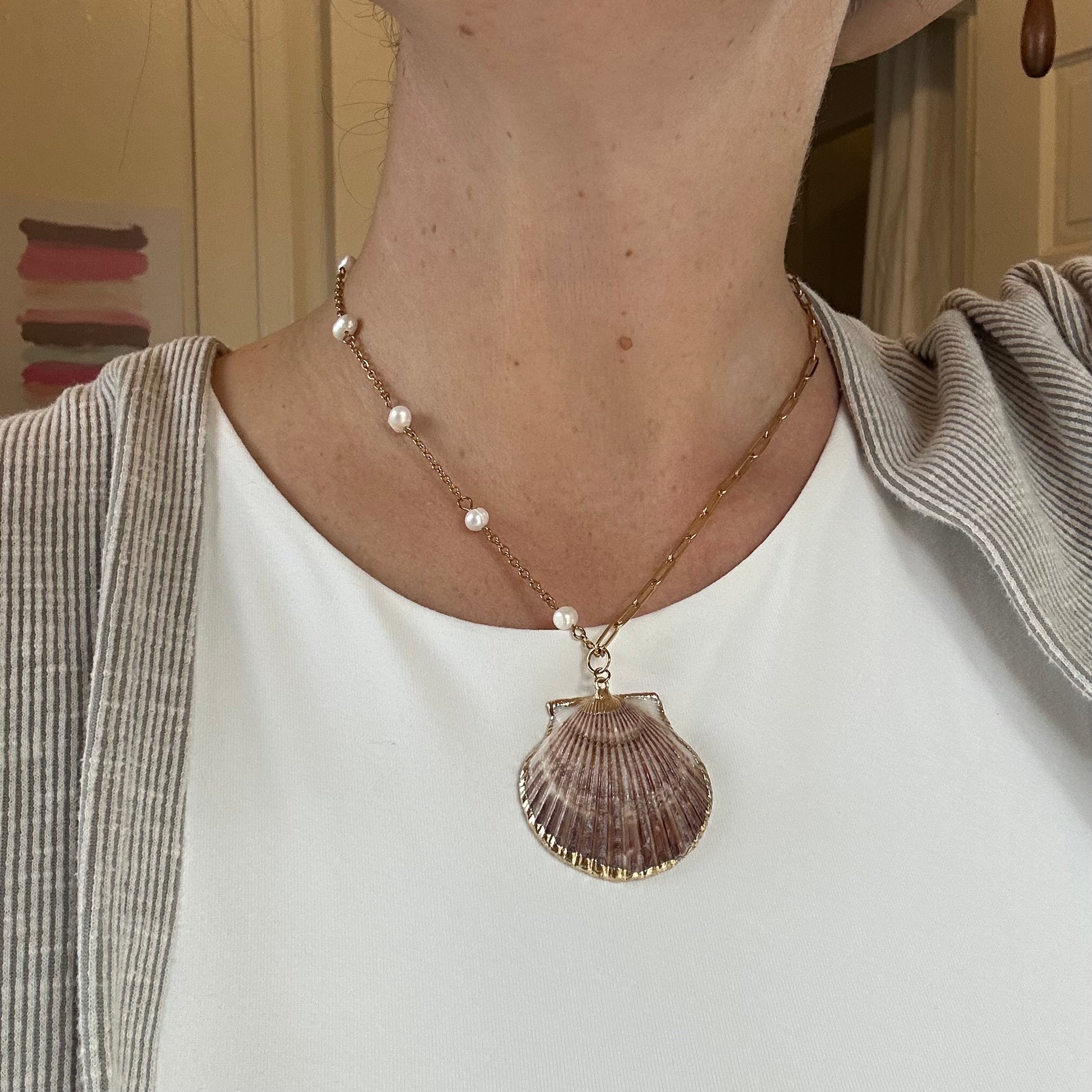 Elegant twist on this handmade necklace! Half mini paperclip chain, half freshwater pearl beaded chain (18k gold plated stainless steel materials) Coffee brown toned scallop shell with gold accents! Approximately 17-18.5 inches in adjustable length including lobster claw clasp and extender