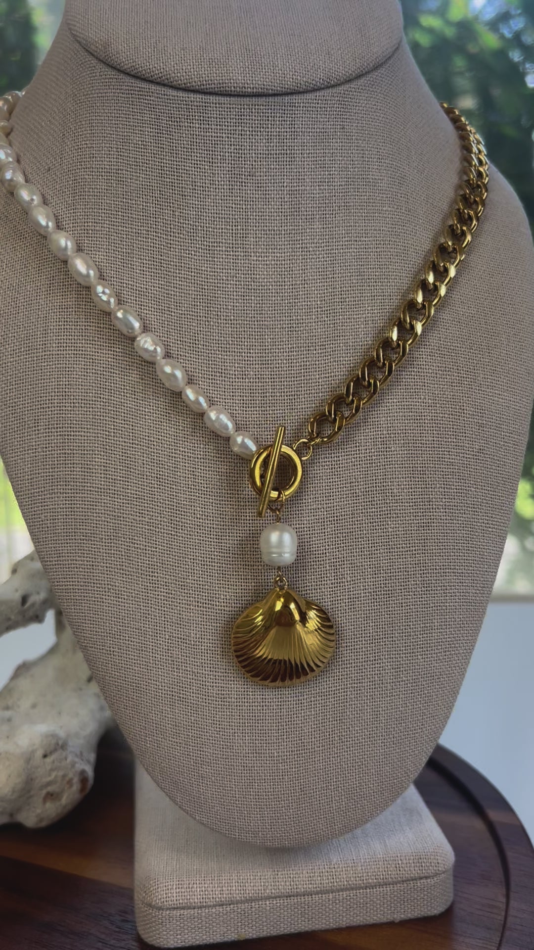 Tons of detail in this necklace! Half freshwater pearls (irregular fluid shaped), half Cuban link chain. Chunky seashell and pearl charm featured in the center. Toggle bar closure. 18k gold plated- stainless steel filled materials that are durable and tarnish resistant! Approximately 17 inches in length not including the charm drop. New, unworn other than brief fit reference photo.