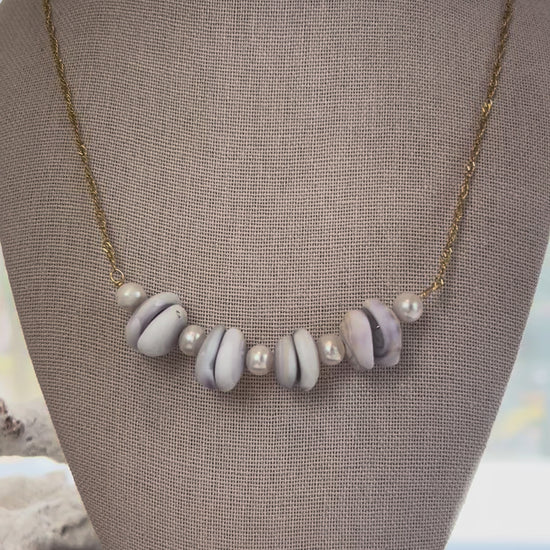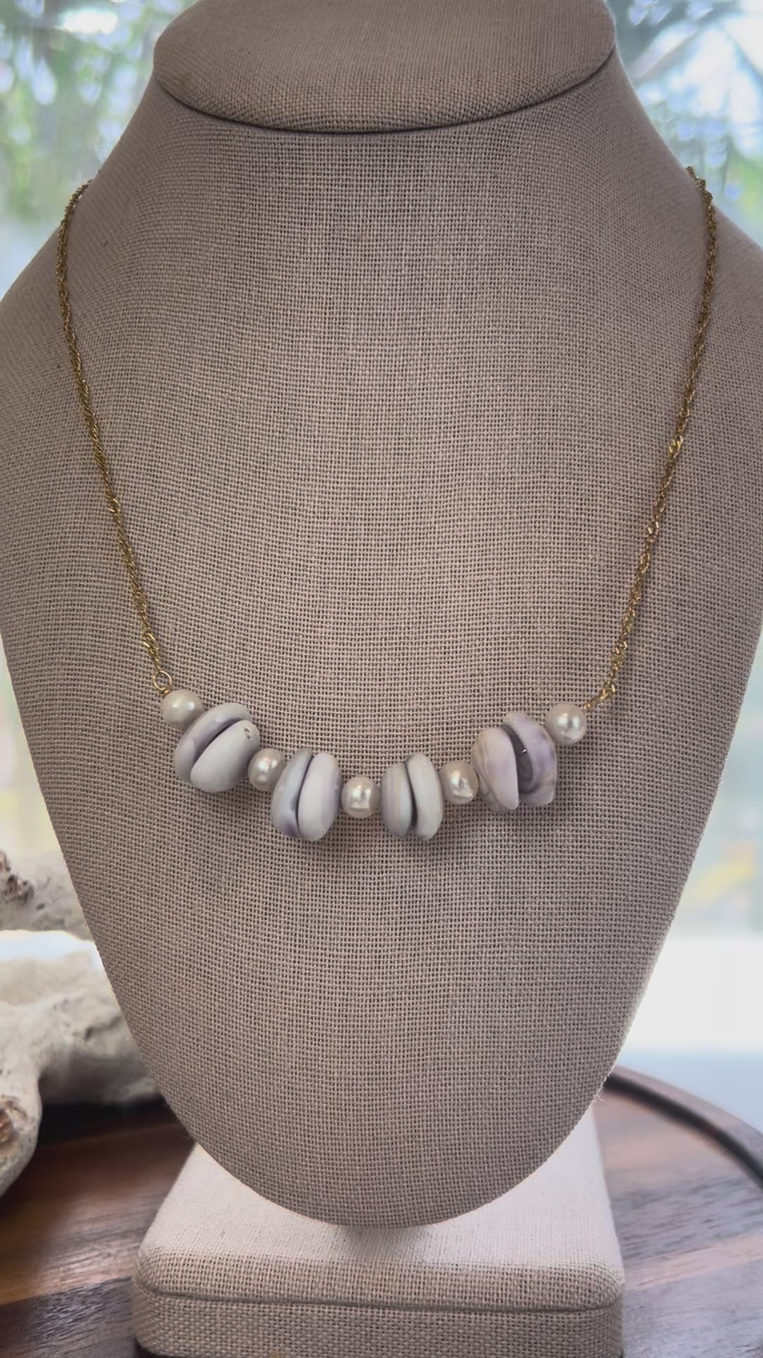 Handmade in Hawaii! Lovely puka shells paired together with freshwater pearls in between. Sheared of purple and tan. On 18k gold plated, stainless steel elements. Approximately 18.5-20.5 inches in total adjustable length including lobster claw clasp and extender. Finished with a mini freshwater pearl accent!