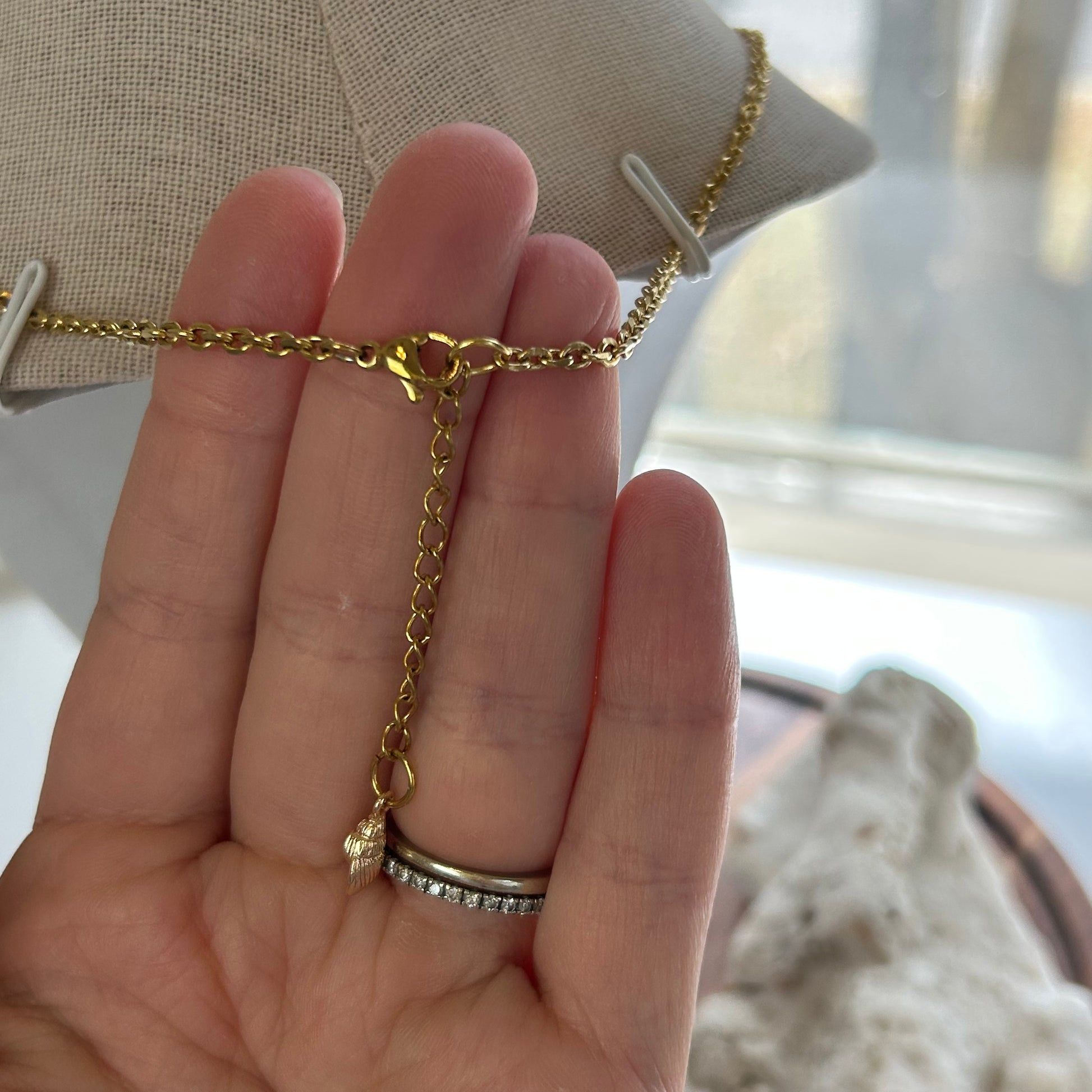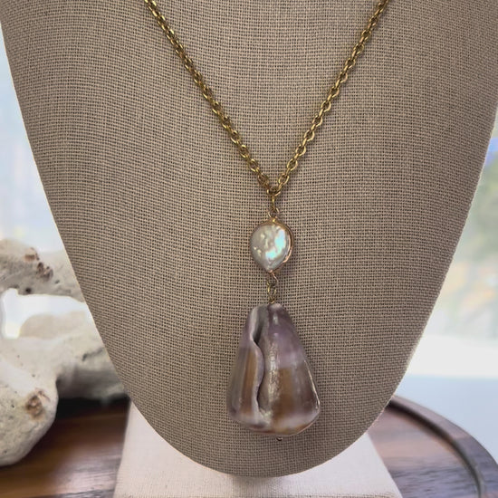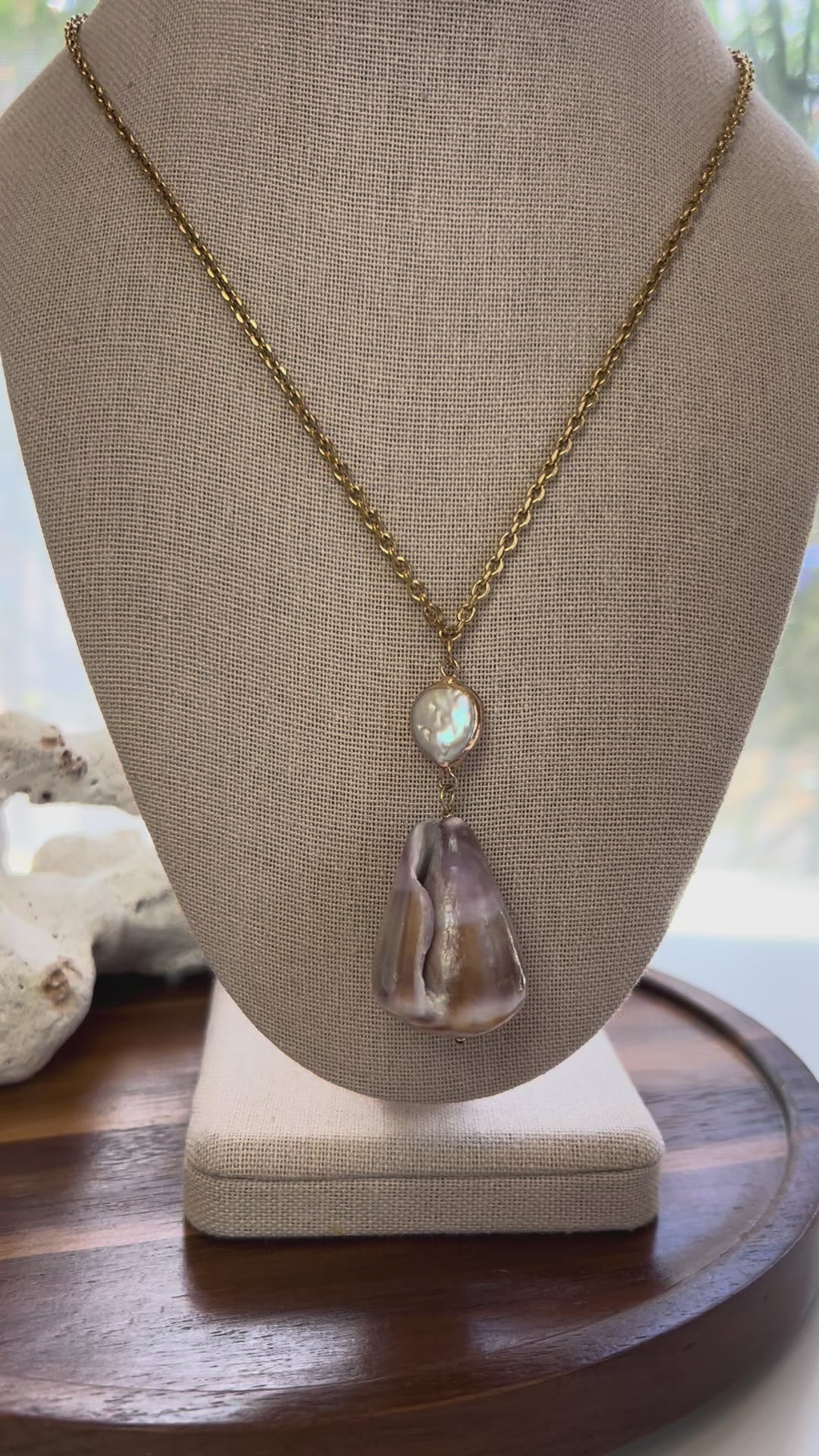 Handmade in Hawaii! A stunning statement cone shell with purple and brown tones (gloss finish). Paired with a mother of pearl charm with gold accents! On an 18k gold plated, stainless steel link chain. Approximately 18-20 inches in total adjustable length including lobster claw clasp and extender! Finished with a mini gold shell charm. New unworn except for brief fit reference photo!