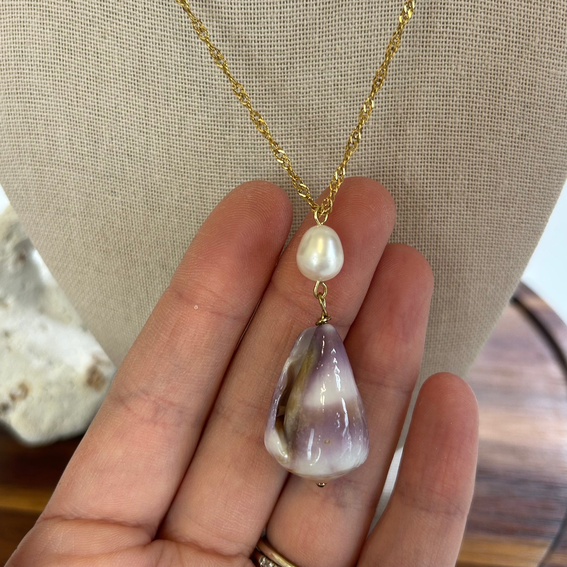 Shell & Pearl- Beautiful lavender and brown toned cone Shell (with a gloss finish) pendant necklace with freshwater pearl drop detail! On an 18k gold plated, stainless steel dainty twist chain. Approx 16-17.5 inches in total length including lobster claw clasp and extender.