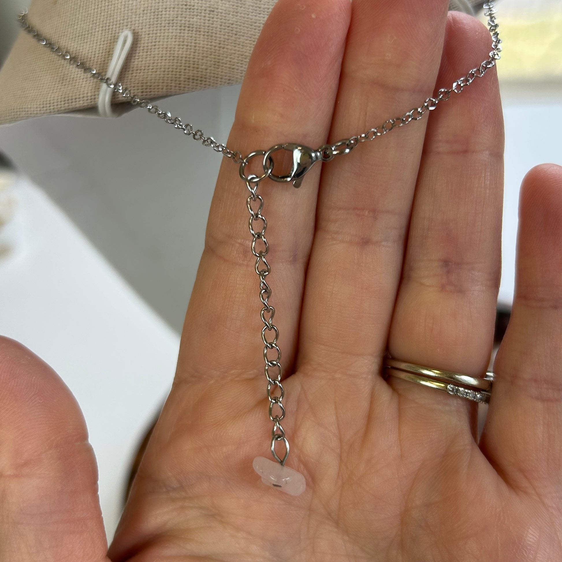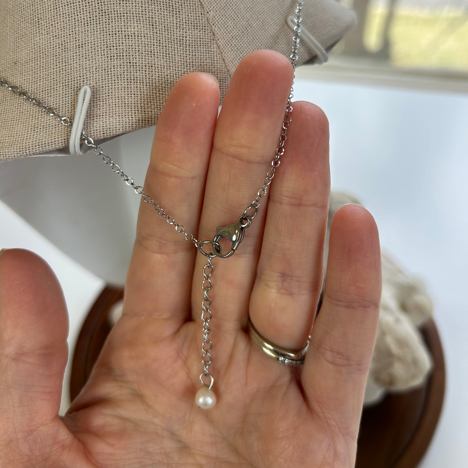 Handmade in Hawaii, simple charm pendant necklaces! Featuring silver toned stainless steel elements (durable and tarnish resistant) circle bobblw link chains with longer claw clasps and extender. With natural pearl or stone accents!