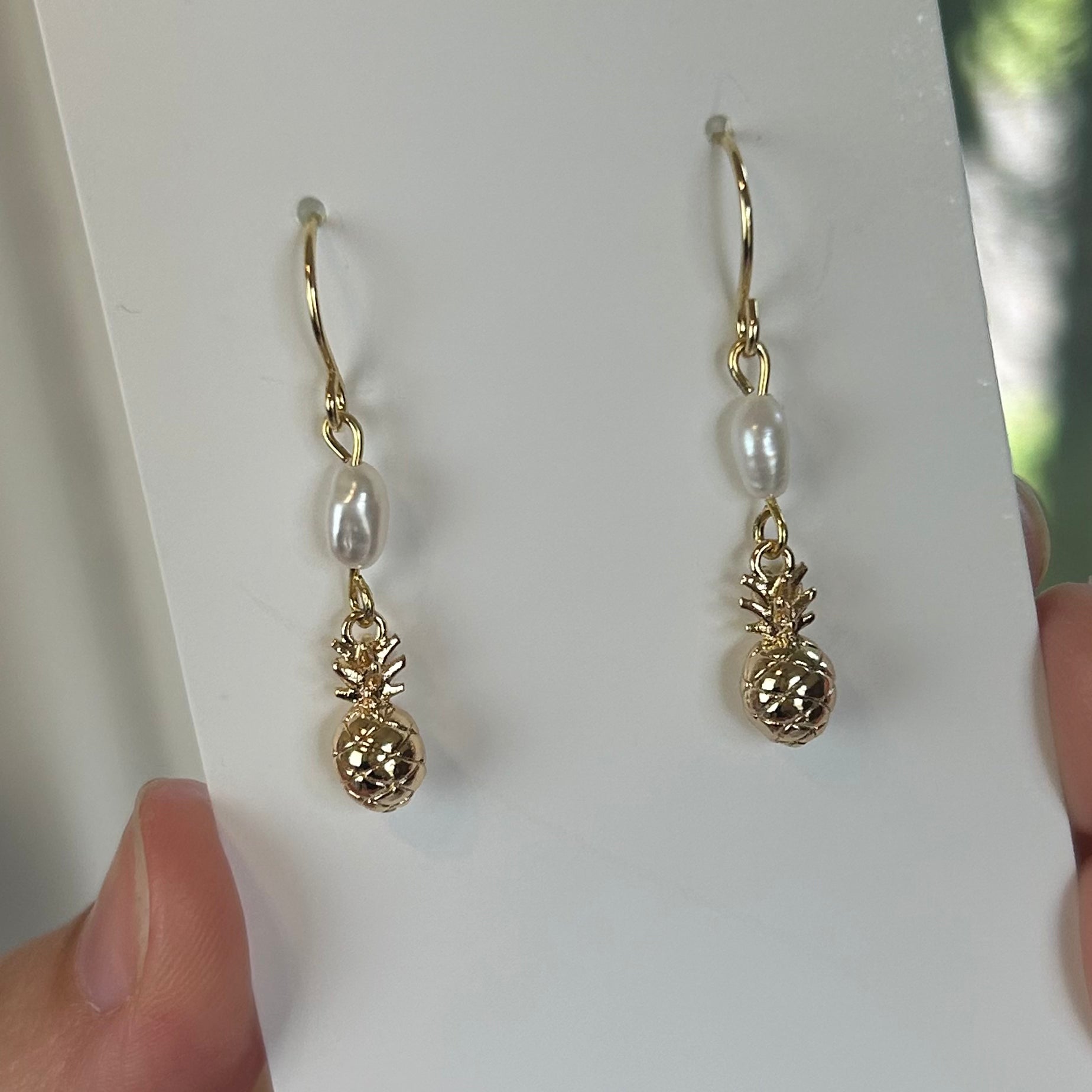 Adorable mini pineapples and pearls on these dainty earrings! High quality gold plated brass pineapples and 18k gold plated, stainless steel filled ear wire hooks. Natural irregular freshwater pearls (each one will be just slightly different). Clear backings.