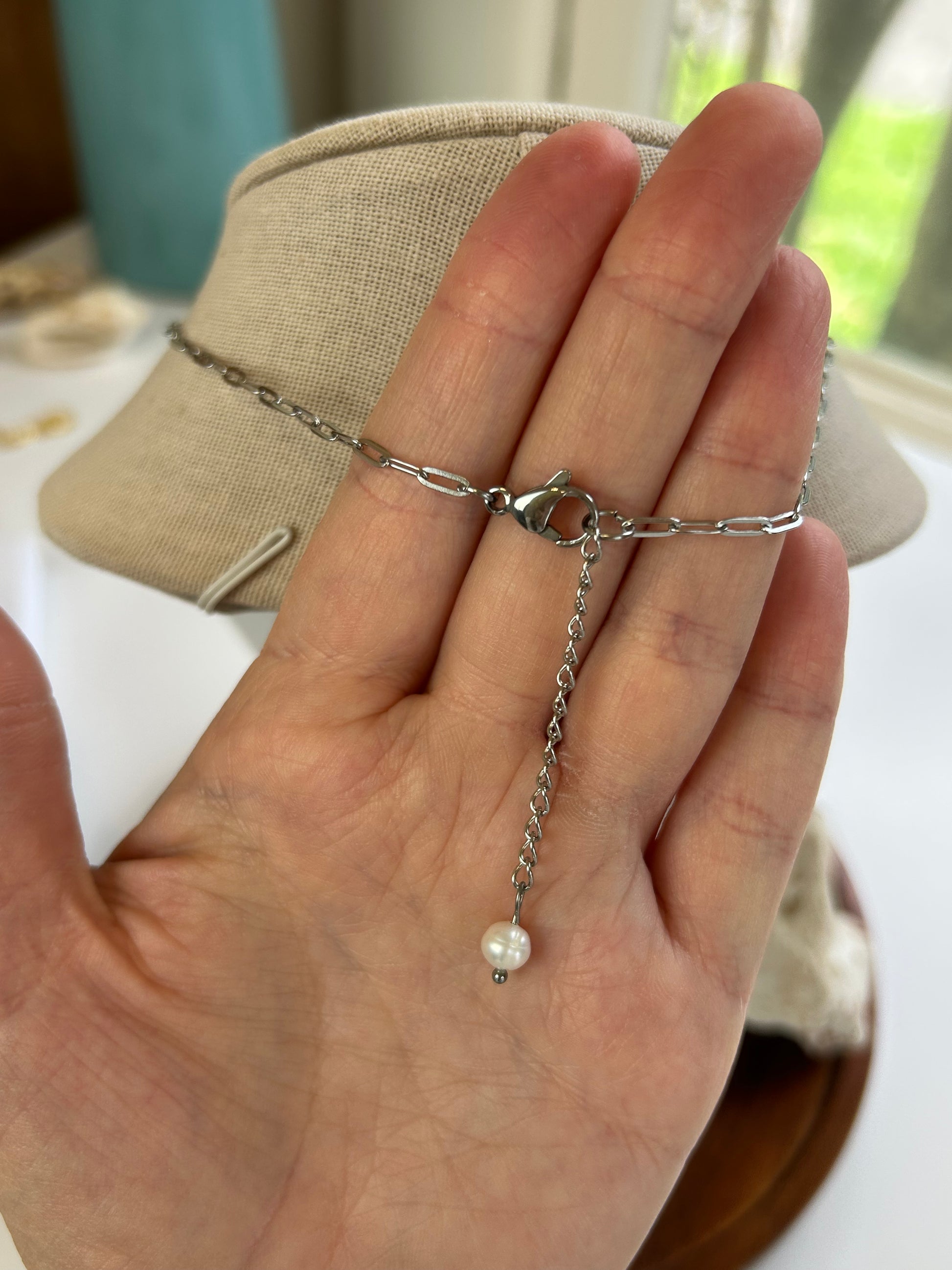 Handmade in Hawaii! Silver toned charm necklace featuring a center whale with zircon accents! Mother of pearl, and freshwater pearl with rose quartz stone. Mini spikey murex shell charm and palm tree charm! Durable, tarnish resistant stainless steel materials *please note these materials have a slightly darker silver tone. Adjustable length between approximately 16.5- 18 inches including lobster claw clasp and extender.